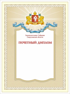 Почетный диплом Законодательного Собрания Свердловской области является формой поощрения органов местного самоуправления муниципальных образований, расположенных на территории Свердловской области, организаций независимо от их организационно-правовых форм за большой вклад в развитие законодательства Свердловской области, местного самоуправления, экономической, научно-технической, социальной, культурной и (или) иных сфер жизни общества, способствующий укреплению и развитию Свердловской области и повышению благополучия жителей Свердловской области.