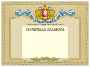 Почетная грамота Законодательного Собрания Свердловской области является формой поощрения граждан Российской Федерации, иностранных граждан, лиц без гражданства независимо от места их проживания за существенный вклад в развитие законодательства Свердловской области, государственной власти и (или) местного самоуправления в Свердловской области, за заслуги в экономической, научно-технической, социальной, культурной и (или) иных сферах жизни общества, способствующие укреплению и развитию Свердловской области, росту ее авторитета в Российской Федерации и за рубежом.
