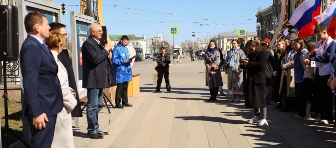 Первый заместитель председателя Законодательного Собрания Свердловской области Дмитрий Жуков и региональный координатор партпроекта «Историческая память», председатель комитета Законодательного Собрания по молодёжной политике, развитию физкультуры, спорта и туризма Елена Чечунова приняли участие в церемонии открытия экспозиции, посвящённой «Диктанту Победы»