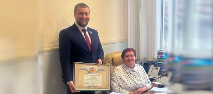 Владимир Смирнов вручил Почётную грамоту Законодательного Собрания Свердловской области Татьяне Сабуровой, главному бухгалтеру Свердловской областной организации «Общество «Динамо»
