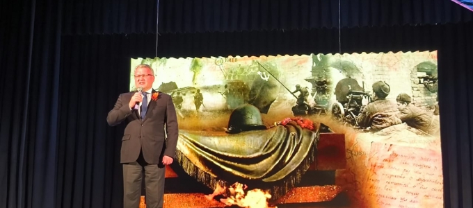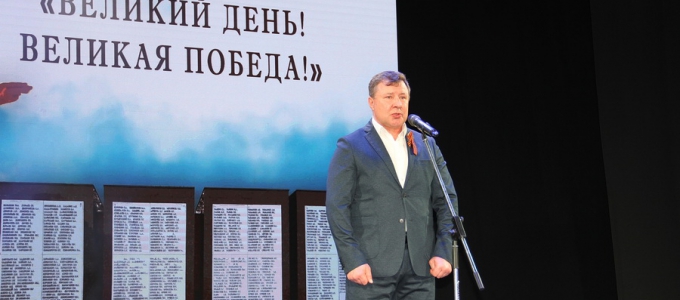 В социально-культурном центре (СКЦ) Каменска-Уральского прошло торжественное собрание в честь 9 мая. Вместе с главой города и председателем гордумы Виктор Якимов вышел на сцену СКЦ и поздравил каменцев со священным праздником
