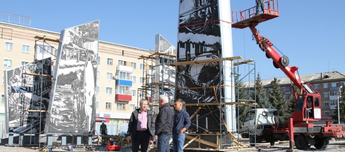 Памятная стела высотой 26 метров сооружается на центральной площади Каменска-Уральского. Вокруг нее монтируются пилоны с исторической информацией и два симметричных сухих фонтана