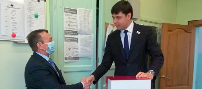 Депутаты Законодательного Собрания Свердловской области Михаил Зубарев и Владимир Радаев подарили сельской общеобразовательной школе оборудование для дезинфекции рук