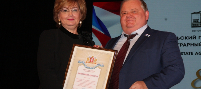 В Екатеринбурге во Дворце молодежи собрались сотрудники, студенты и выпускники вуза-юбиляра – Уральского государственного аграрного университета. Заместитель председателя Законодательного Собрания Виктор Маслаков обратился к участникам торжественного собрания с приветственным адресом от председателя свердловского парламента Людмилы Бабушкиной и вручил самым выдающимся сотрудникам награды Законодательного Собрания Свердловской области.