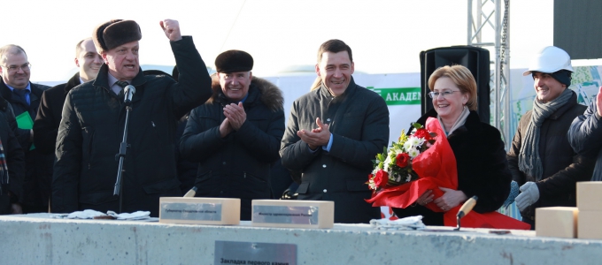 Заместители председателя Законодательного Собрания Виктор Якимов и Виктор Маслаков, заместитель председателя комитета по бюджету, финансам и налогам Михаил Клименко приняли участие в торжественной церемонии закладки первого камня здания Уральского научно-исследовательского института охраны материнства и младенчества в районе Академический