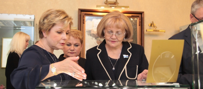 Председатель Законодательного Собрания Свердловской области Людмила Бабушкина вместе с временно исполняющим обязанности губернатора Свердловской области Евгением Куйвашевым открыли юбилейную выставку «Карл Фаберже и Алексей Денисов-Уральский» к 25-летию Музея истории камнерезного и ювелирного искусства