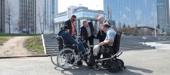 Заместитель председателя Законодательного Собрания Свердловской области Владимир Власов и председатель комитета по социальной политике Вячеслав Погудин приняли участие в презентации мобильной приставки для инвалидных колясок.