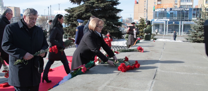 Председатель Законодательного Собрания Свердловской области Людмила Бабушкина вместе с губернатором региона Евгением Куйвашевым возложили цветы к памятнику воинам Уральского добровольческого танкового корпуса в Екатеринбурге