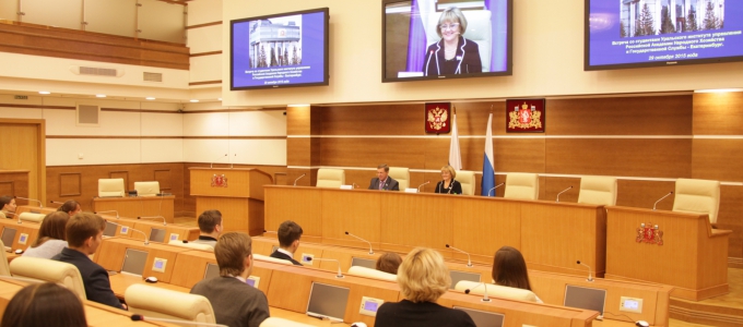 Председатель Законодательного Собрания Людмила Бабушкина и председатель комитета по вопросам законодательства и общественной безопасности Владимир Никитин встретились со студентами Уральского института управления Российской Академии народного хозяйства и государственной службы