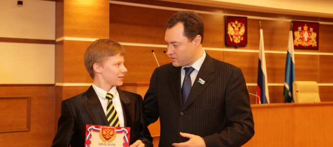 В Законодательном Собрании Свердловской области состоялось награждение победителей конкурса «Звездная эстафета», посвященного 50-летию первого полета человека в космос и Году космонавтики. Церемонию провел организатор конкурса - заместитель председателя Палаты Представителей, депутат от Сысертского избирательного округа Александр Серебренников.