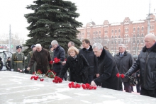 В возложении цветов приняли участие полномочный представитель президента РФ в Уральском федеральном округе Игорь Холманских, губернатор Свердловской области Евгений Куйвашев, председатель Законодательного Собрания Свердловской области Людмила Бабушкина, заместитель председателя Законодательного Собрания Виктор Шептий, представители военного командования, ветераны, представители общественности.
