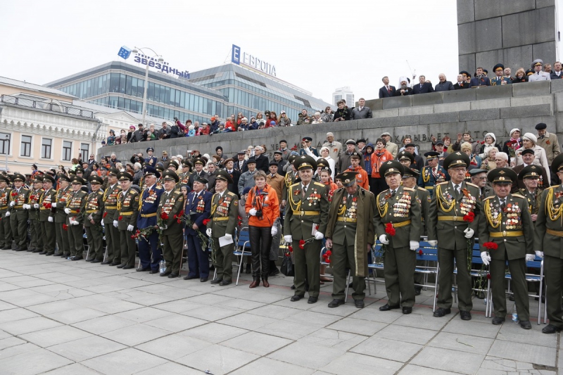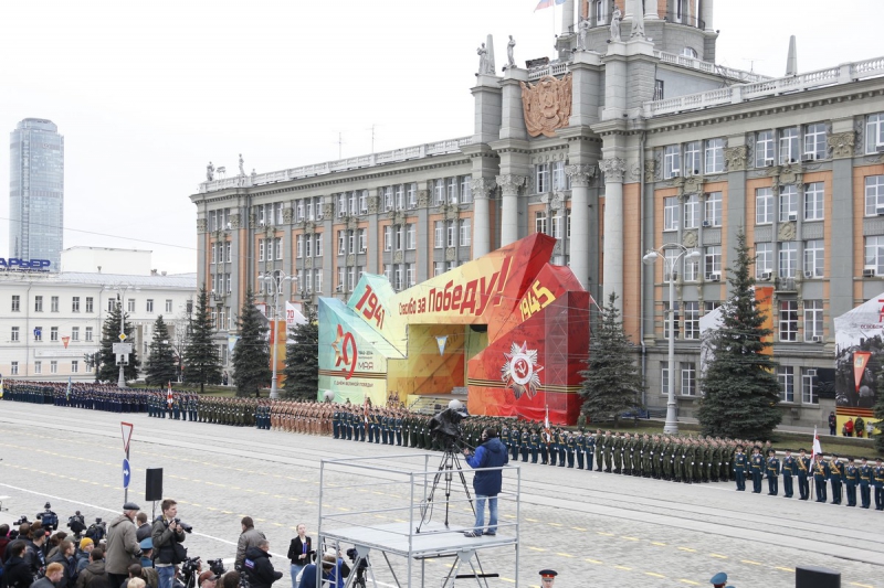 Участников парада 9 мая приветствовал губернатор Свердловской области Евгений Куйвашев. Совместно с главой региона с трибуны за продвижением войск и техники на площади наблюдали председатель Законодательного собрания Людмила Бабушкина, члены Совета Федерации Эдуард Россель и Аркадий Чернецкий, представители духовенства и военнослужащие.