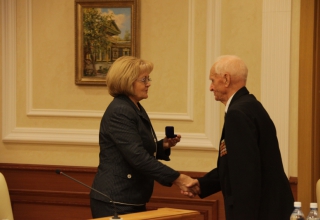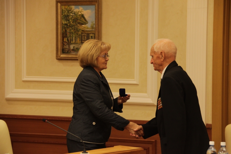 Председатель Законодательного Собрания Людмила Бабушкина вручила награду – золотой знак Законодательного Собрания Свердловской области – Виктору Ивановичу Ковалеву, председателю Совета Центра общественных связей Свердловской области, ветерану Великой Отечественной войны.