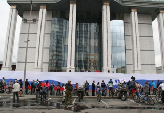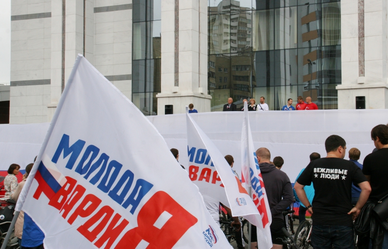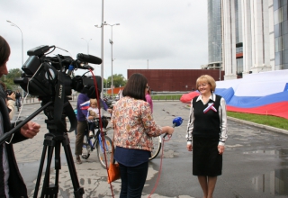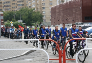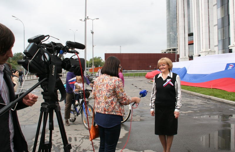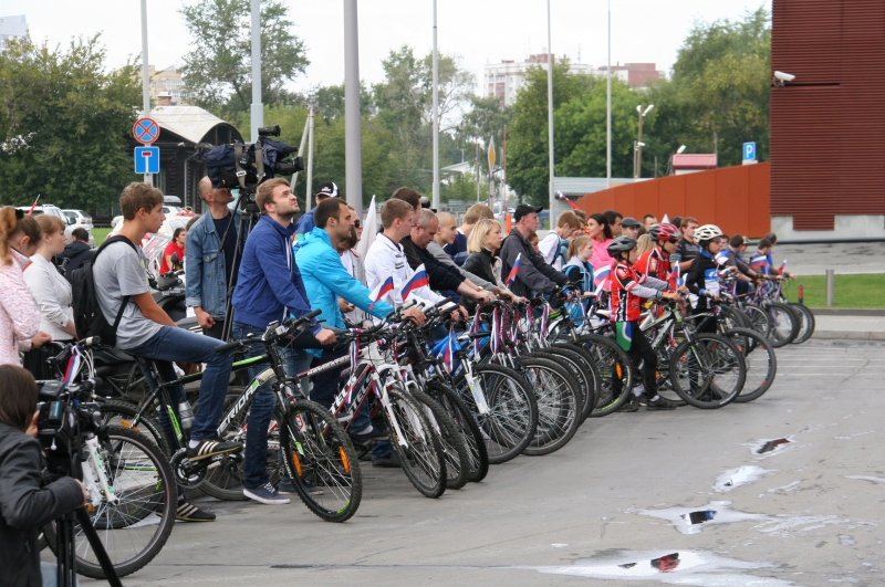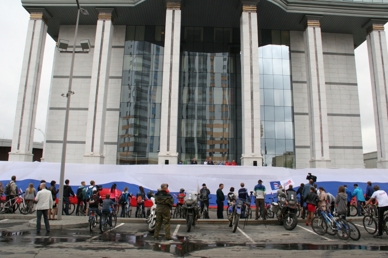 У здания Законодательного Собрания Свердловской области собрались депутаты, члены областного правительства, представители общественных организаций и молодежных объединений, спортсмены и любители велогонок, а также активисты всероссийского мотопробега Владивосток-Москва «Отцы России за многодетную семью», прибывшие в Екатеринбург.
