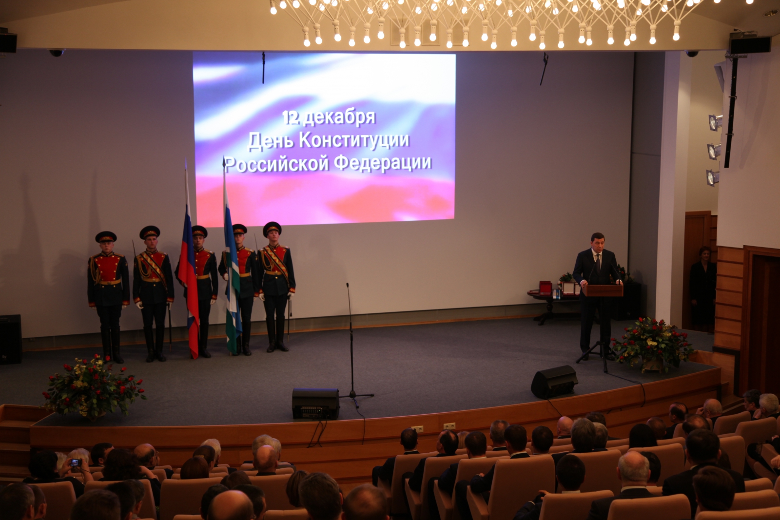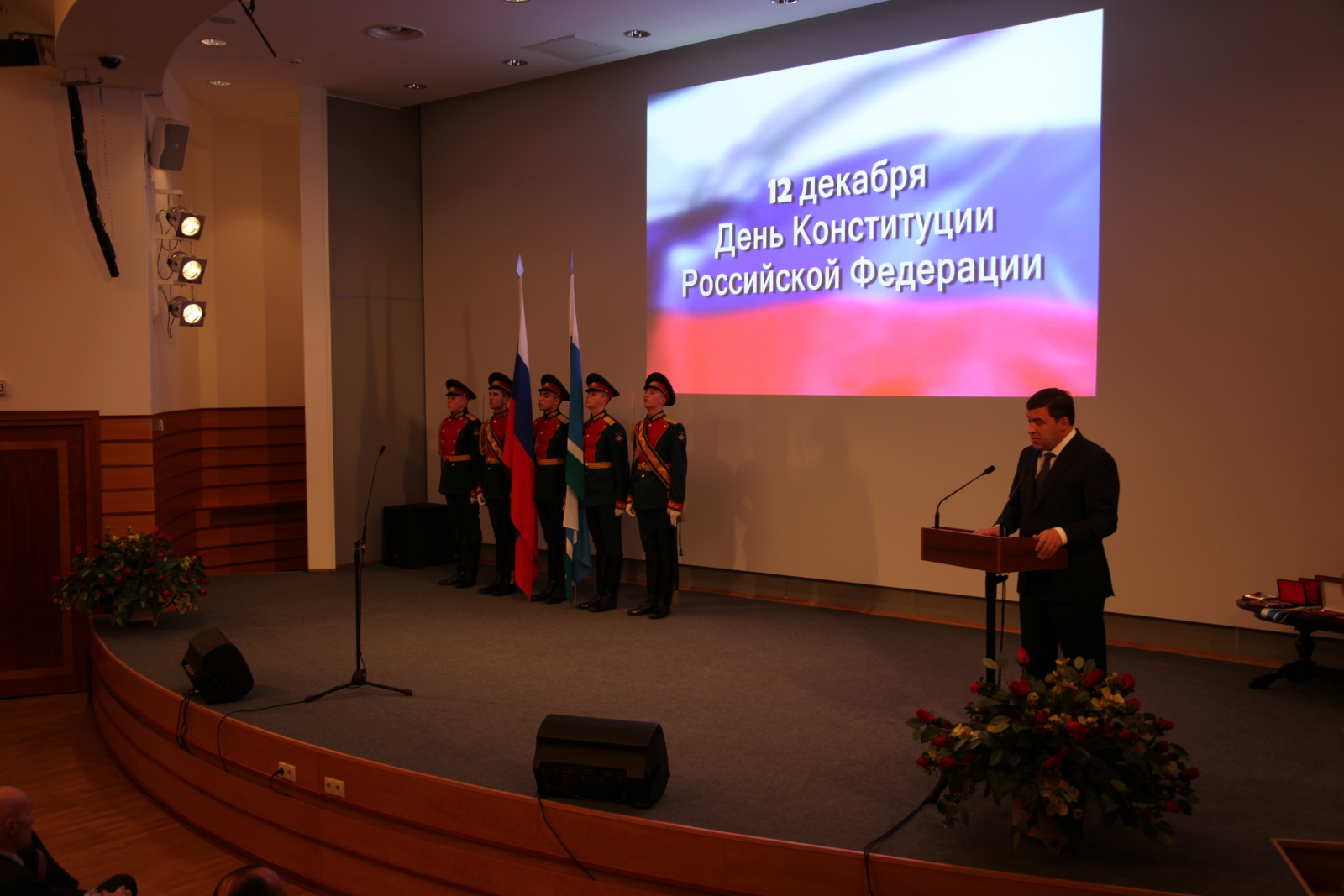 Собравшихся в зале приветствовал губернатор Свердловской области Евгений Куйвашев, который поздравил жителей области с Днем Конституции России, который будет отмечаться 12 декабря, и вручил государственные и областные награды производственникам, деятелям культуры, искусства, ветеранам спорта.