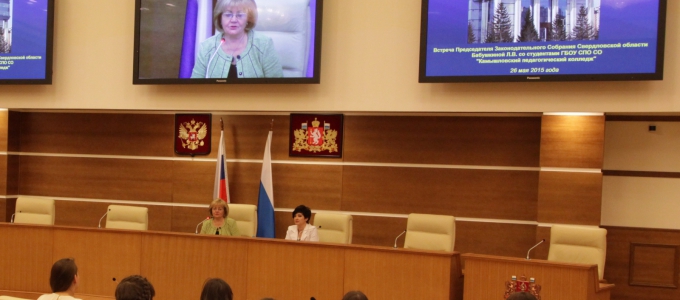 Сегодня в Законодательном Собрании побывали педагоги и студенты Камышловского педагогического колледжа. Знакомство с высшим законодательным органом началось с экскурсии по зданию. Гости осмотрели экспонаты музея, залы заседаний, экспозицию государственных символов Свердловской области, стенды, посвященные межпарламентской деятельности. Затем состоялась встреча с председателем Законодательного Собрания Свердловской области Людмилой Бабушкиной.