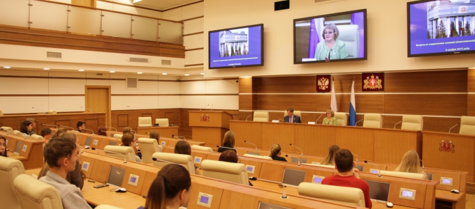 Приветствуя будущих юристов в стенах областного парламента, председатель Законодательного Собрания Свердловской области Людмила Бабушкина особо подчеркнула, что депутаты придают большое значение юридической чистоте и качеству принимаемых законов, прававой культуре. Урал славится мощной юридической школой, и важно эту высокую планку сохранить. Вот почему руководство Законодательного Собрания охотно встречается со слушателями юридической школы и информирует их о своей работе, выслушивает их предложения. В подтверждение открытости областного парламента Людмила Бабушкина привела такую цифру: за четыре года депутатами нынешнего созыва принято 164 делегации разного уровня, это порядка 3500 человек.