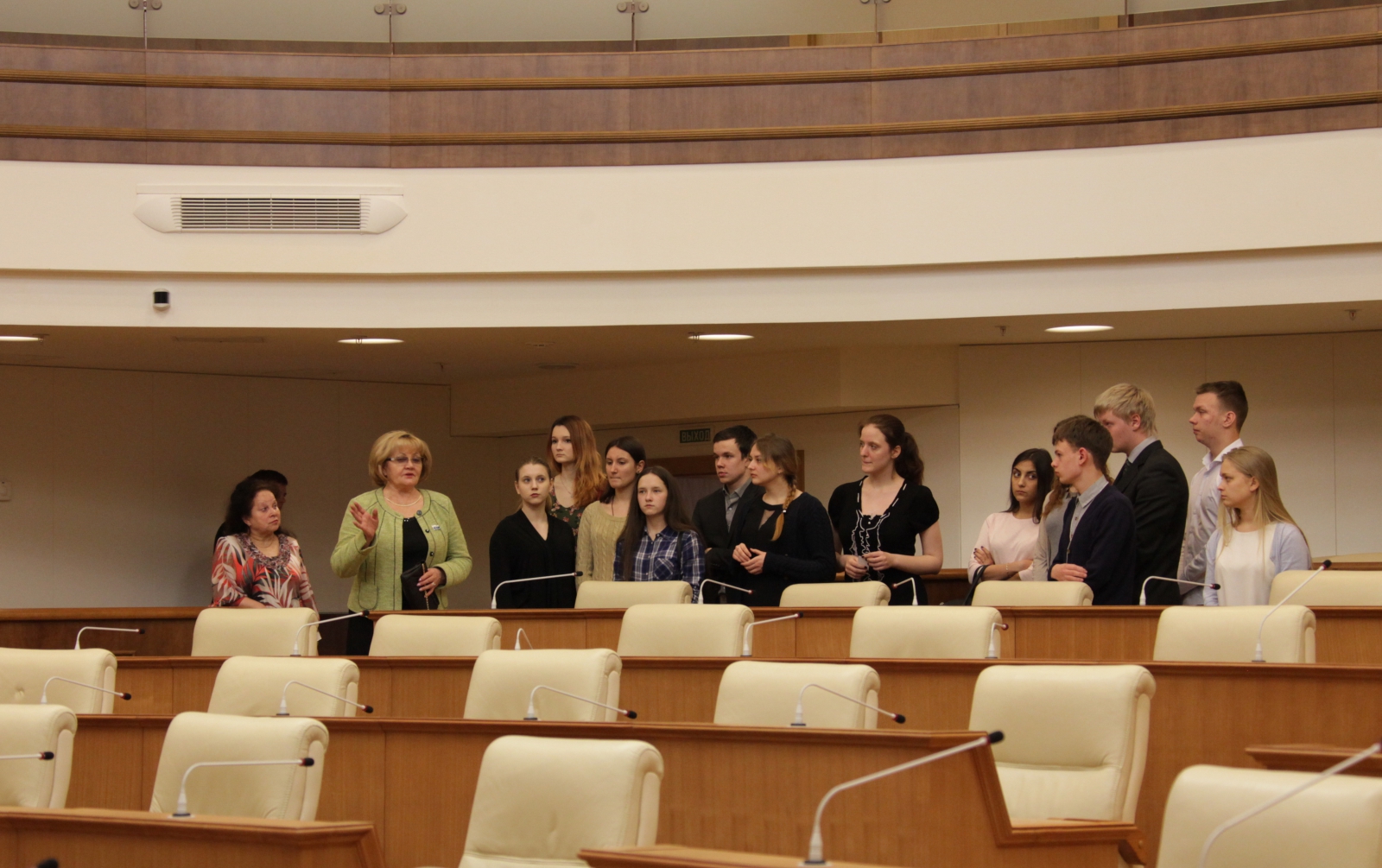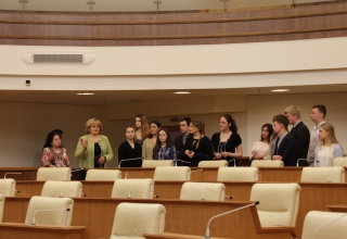 Затем состоялась экскурсия по зданию Законодательного Собрания. Ребятам показали большой зал, где проходят пленарные заседания, музей Заксобрания, экспозицию государственных символов Свердловской области, стенды, посвященные межпарламентской деятельности.