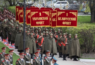 На большом экране демонстрировались кадры Парада Победы 1945-го года, а на площади был воспроизведен один из фрагментов – шествие со штандартами фронтов и низложение фашистских знамен.