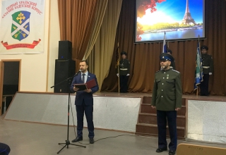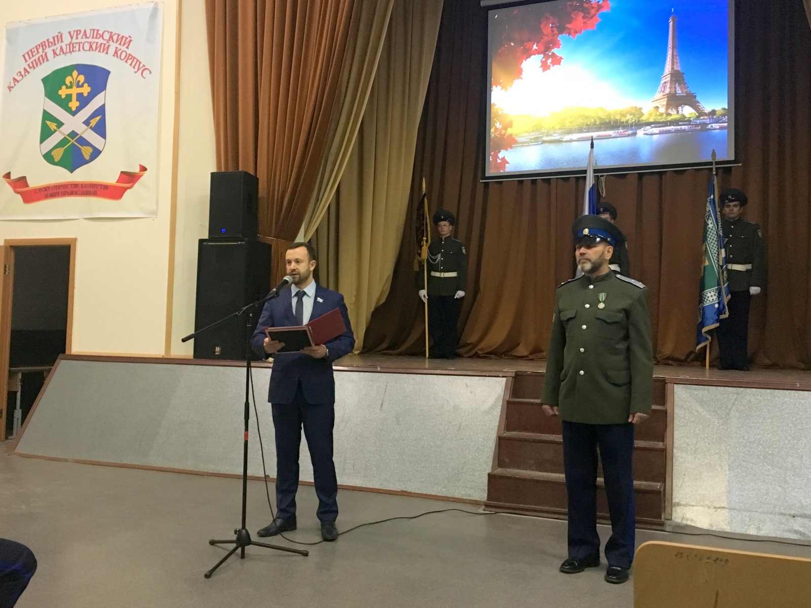 По традиции депутат заехал в Богданович поздравить с праздником преподавательский коллектив и кадетов Первого Уральского казачьего кадетского корпуса.