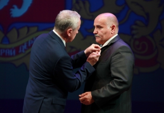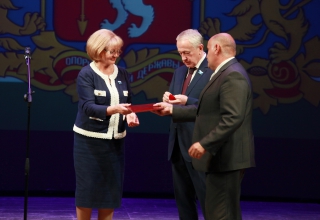 Спикер регионального парламента вручила Золотой знак Законодательного Собрания заместителю главы администрации Нижнего Тагила по социальным вопросам Валерию Сурову за многолетний труд на благо жителей города и большой вклад в решение социальных вопросов.