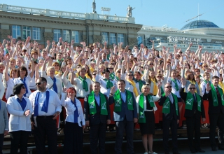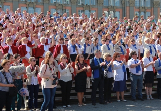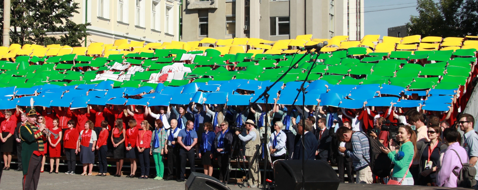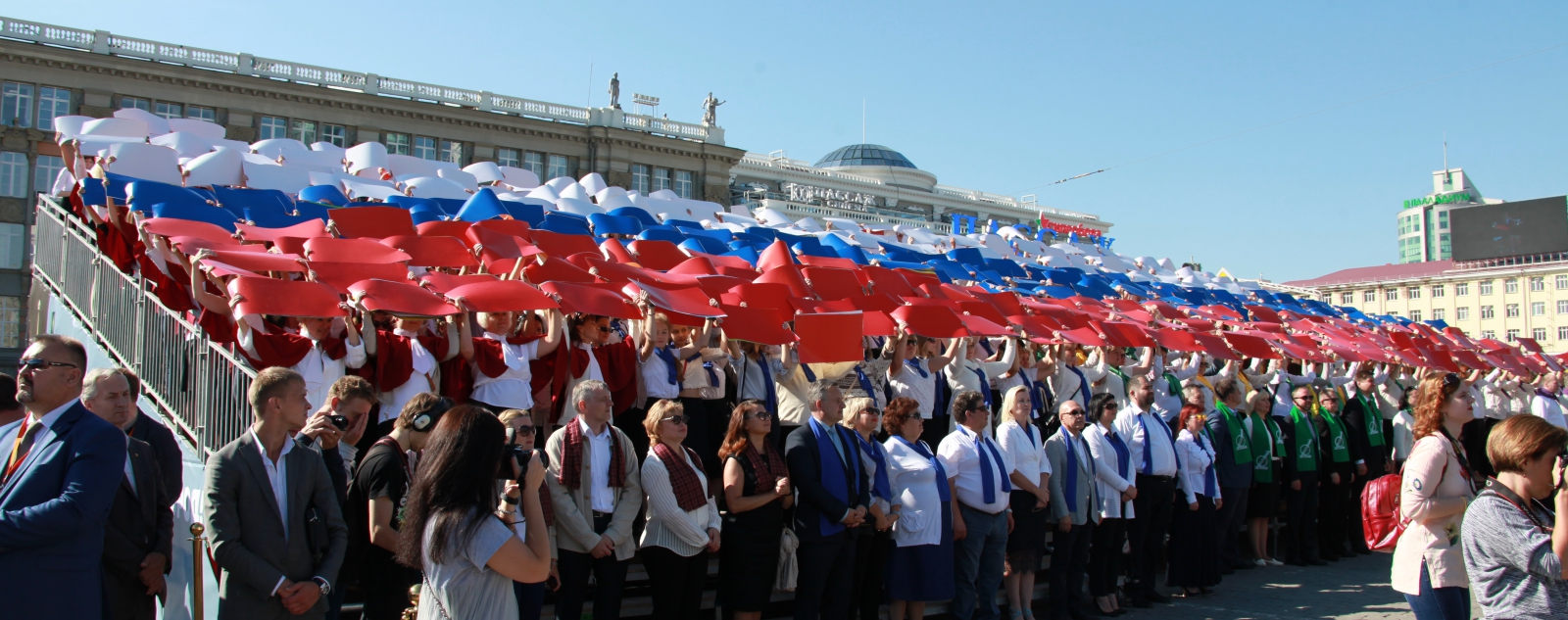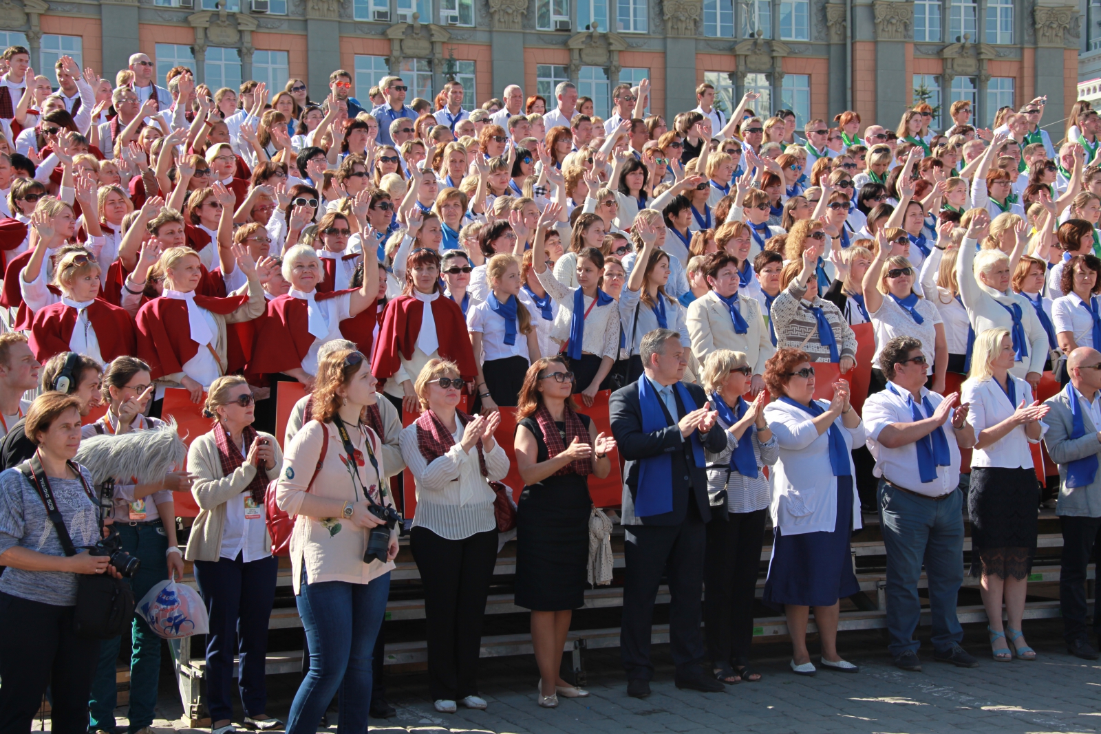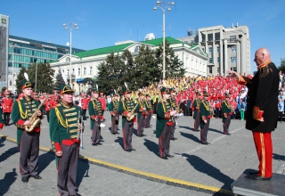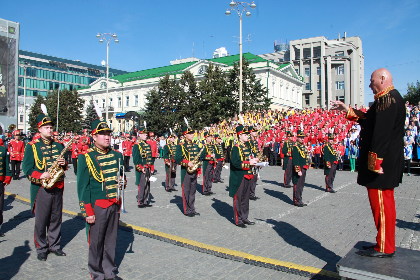 Жителей и гостей уральской столицы приветствовали участники V Международного фестиваля духовых оркестров. Зрители на трибунах, поднимая враз специальные карточки, складывали изображения российского флага и флага Екатеринбурга.