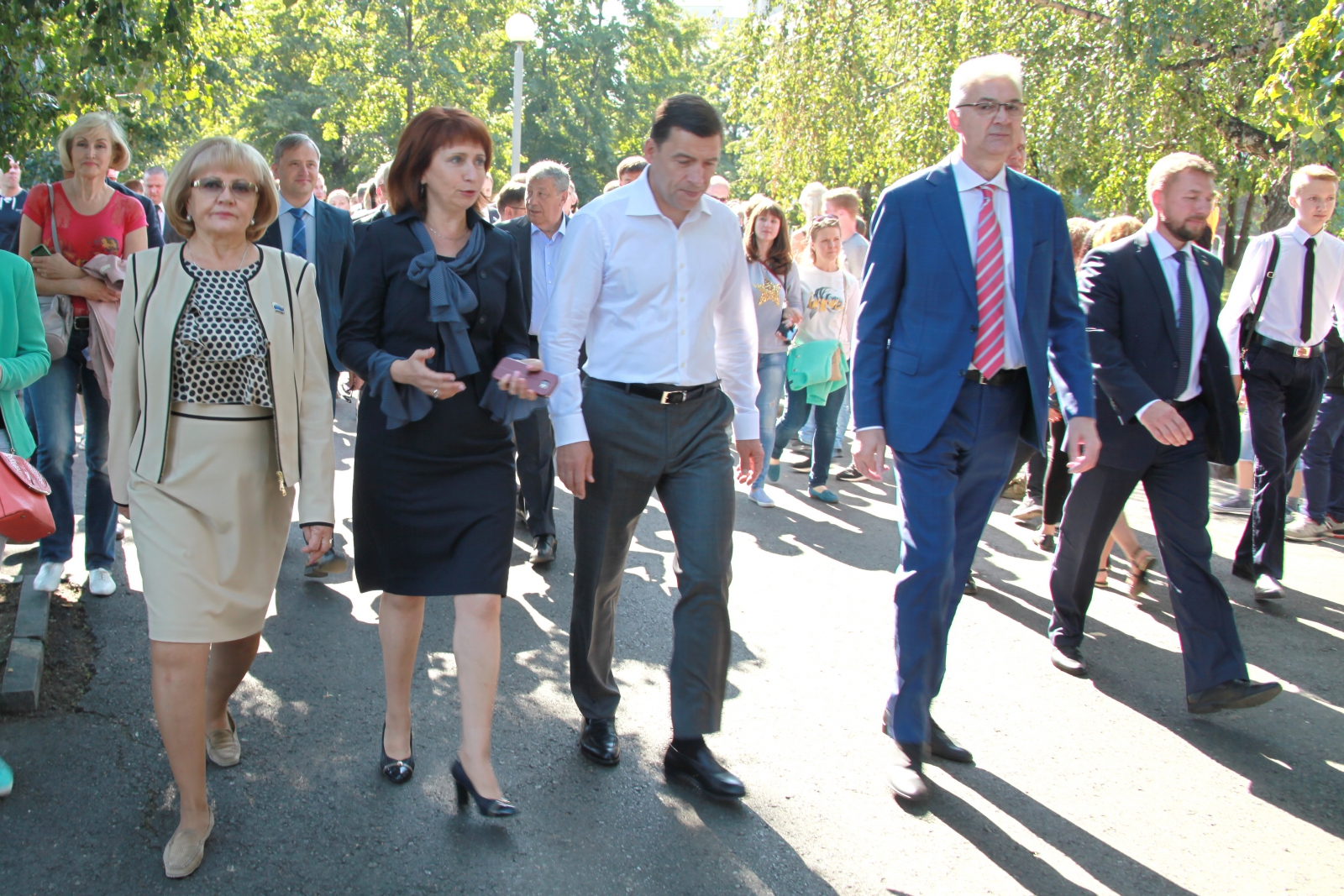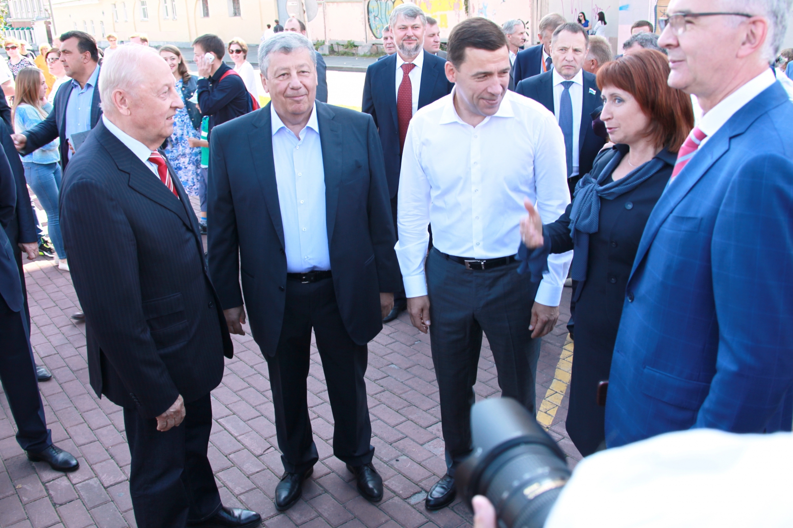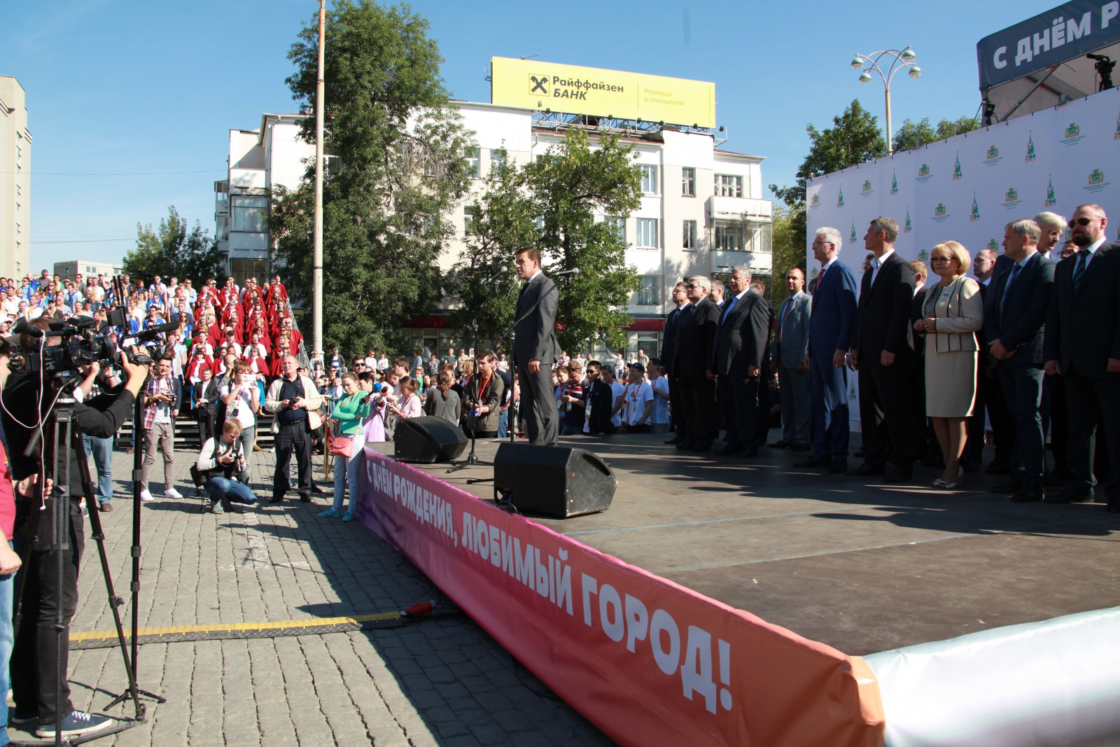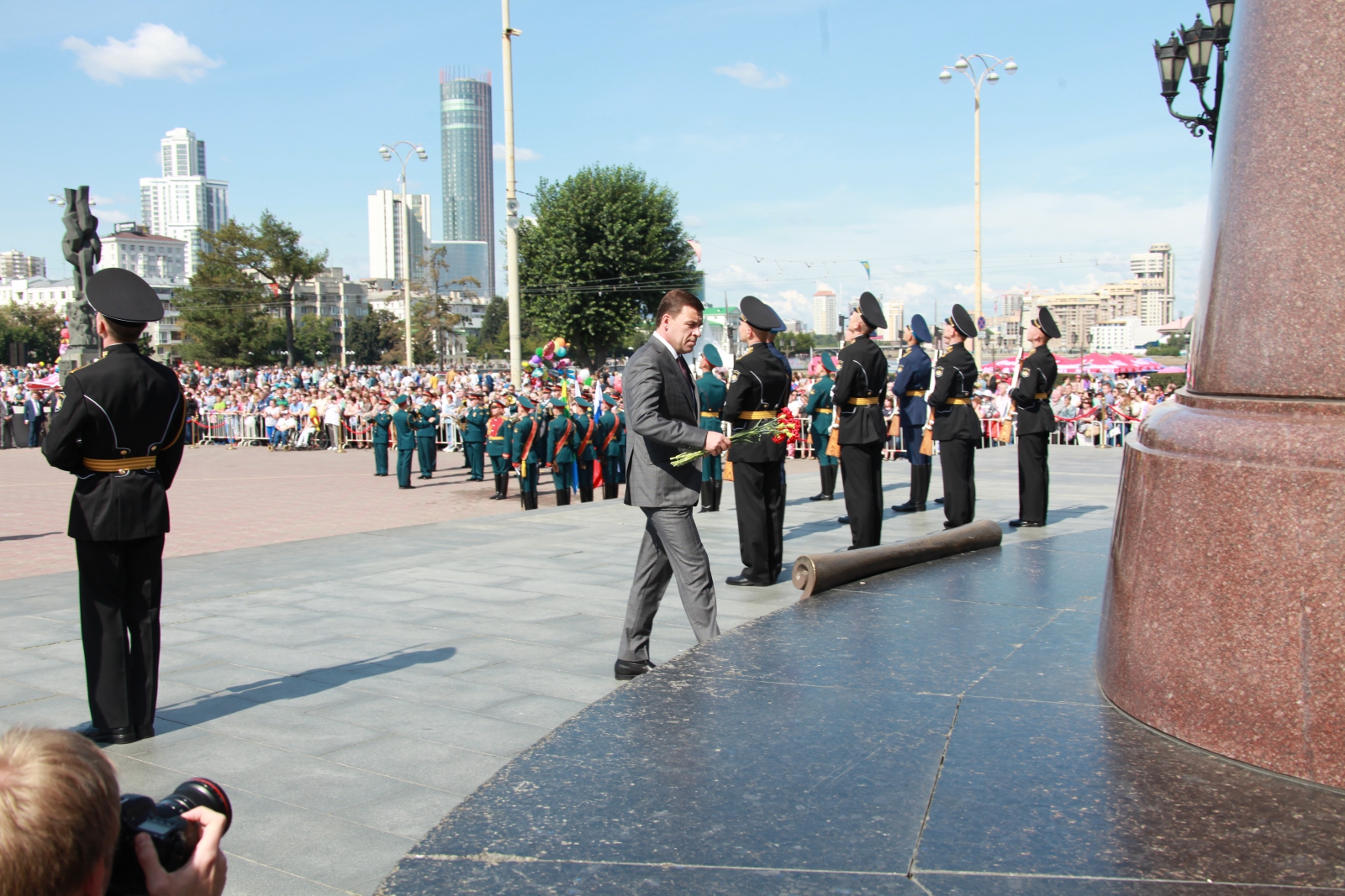 Временно исполняющий обязанности губернатора Свердловской области Евгений Куйвашев, приветствуя собравшихся на площади, назвал город дерзким и амбициозным: «Екатеринбург готовится принять матчи Чемпионата мира по футболу, здесь проходит главная промышленная выставка страны. Екатеринбург вместе с другими столицами государств борется за право проведения Всемирной универсальной выставки «ЭКСПО». Город является местом притяжения умных и талантливых людей, которые привносят в него новые идеи и развитие». Глава региона выразил уверенность, что к своему 300-летию Екатеринбург подготовится самым лучшим образом, здесь будут построены новые дома, гостиницы, широкие проспекты. Евгений Куйвашев пожелал всем хорошего настроения и счастливой жизни в любимом городе.