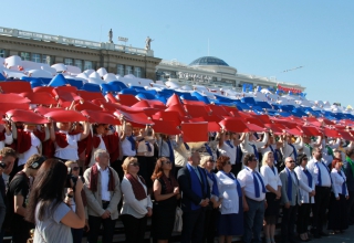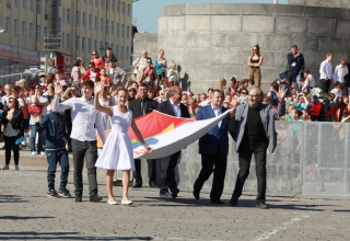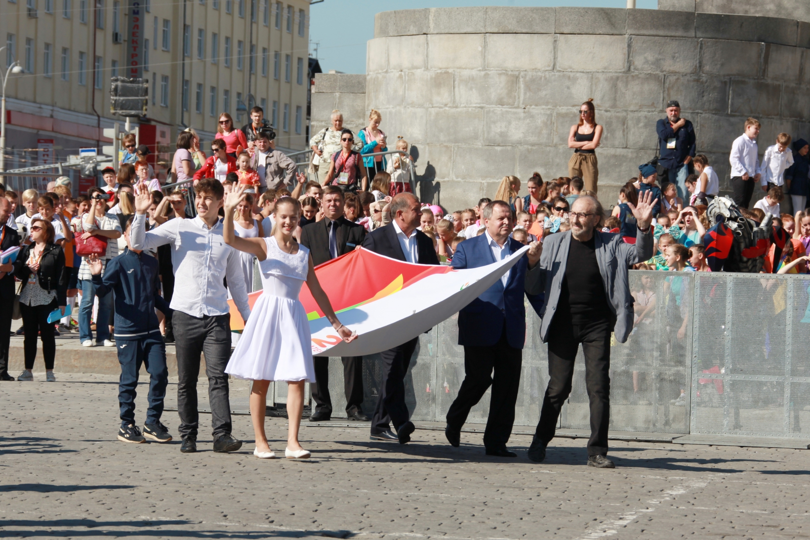 Флаг культурной программы Дня города на площадь внесли представители сферы культуры, науки, образования и спорта, в их числе - народный художник России Виталий Волович, доктор химических наук, академик Российской академии наук Валерий Чарушин, мастер спорта по футболу, заслуженный тренер России Григорий Иванов, а также молодые дарования Екатеринбурга.