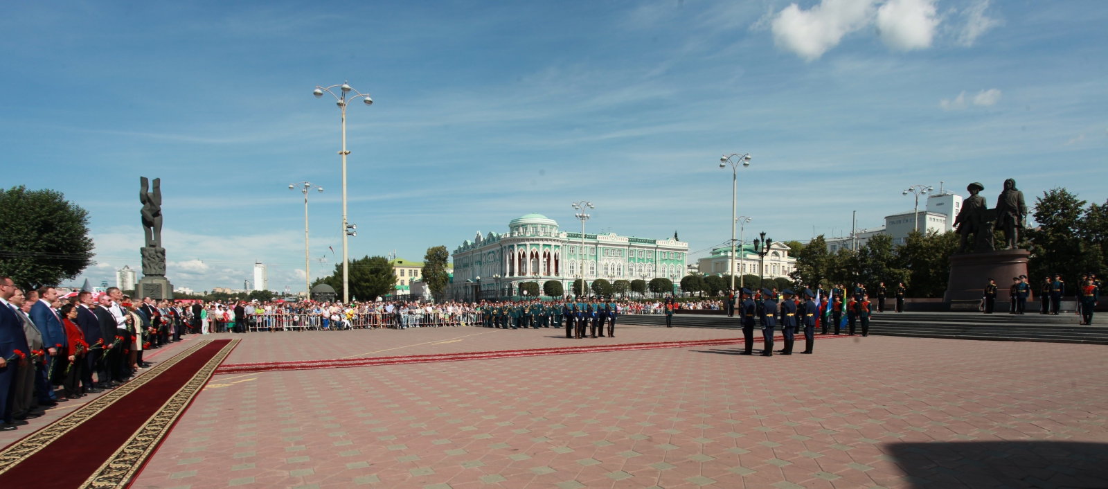 Утром 19 августа на Площади 1905 года под звуки духовых оркестров состоялась церемония поднятия флага Дня города Екатеринбурга, давшая старт праздничным мероприятиям. На трибунах – представители семи районов уральской столицы. Среди почетных гостей – временно исполняющий обязанности губернатора Свердловской области Евгений Куйвашев, председатель Законодательного Собрания Свердловской области Людмила Бабушкина, члены Совета Федерации Федерального Собрания РФ Эдуард Россель и Аркадий Чернецкий, депутаты Законодательного Собрания, официальная делегация китайского города-побратима Гуанчжоу, почетные граждане Екатеринбурга.