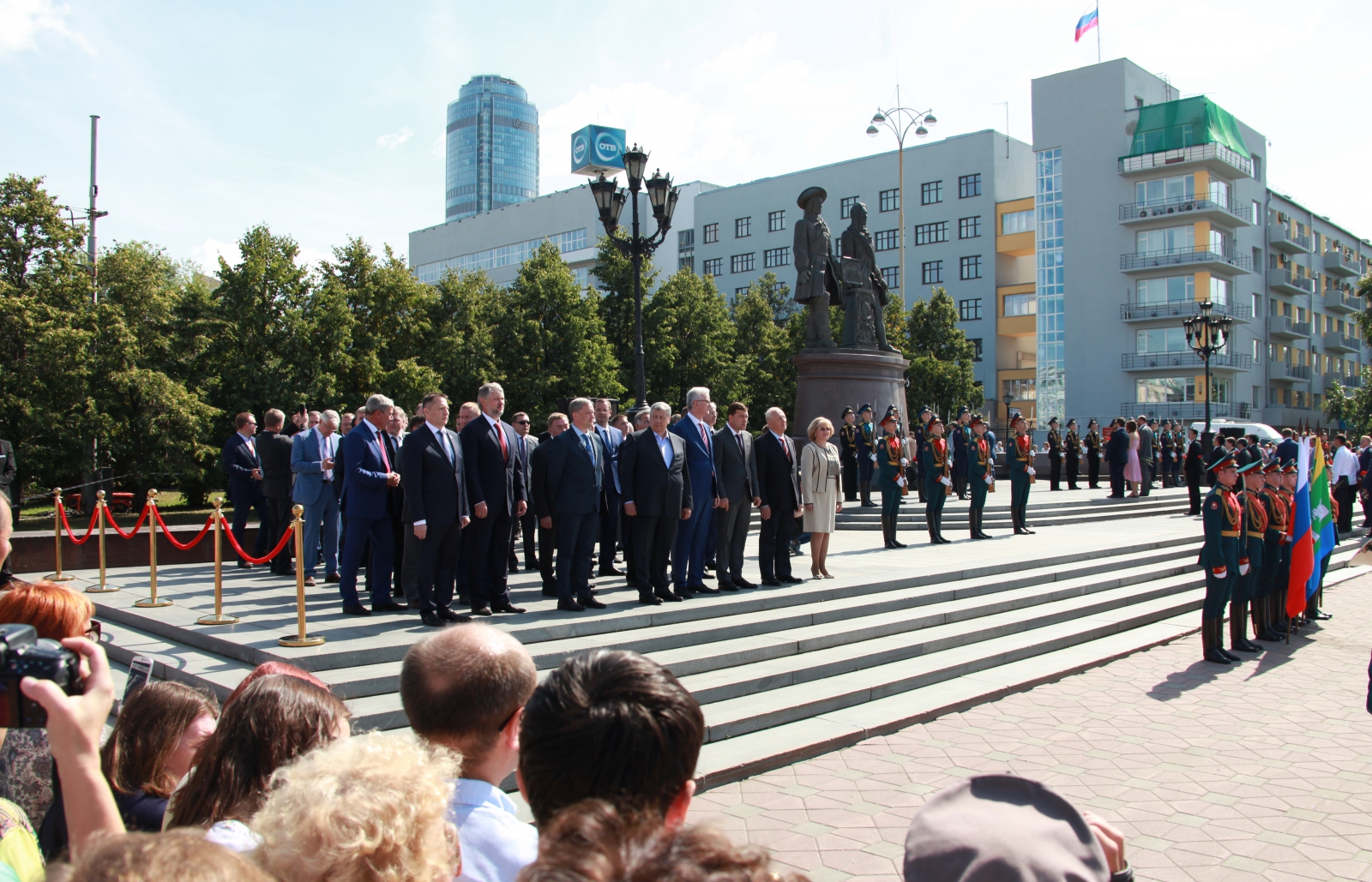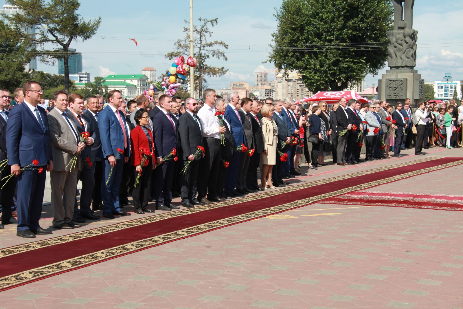 В 12.00 в Историческом сквере по традиции состоялась торжественная церемония возложения цветов к памятнику основателям Екатеринбурга – Василию Татищеву и Вильгельму де Геннину. Цветы возложили руководители области и города, депутаты областного парламента и городской Думы, Почетные граждане Ектеринбурга, представители консульских учреждений, делегация китайского города Гуанчжоу, жители и гости уральской столицы. Церемонию сопровождал оркестр штаба Центрального военного округа и рота почетного караула.