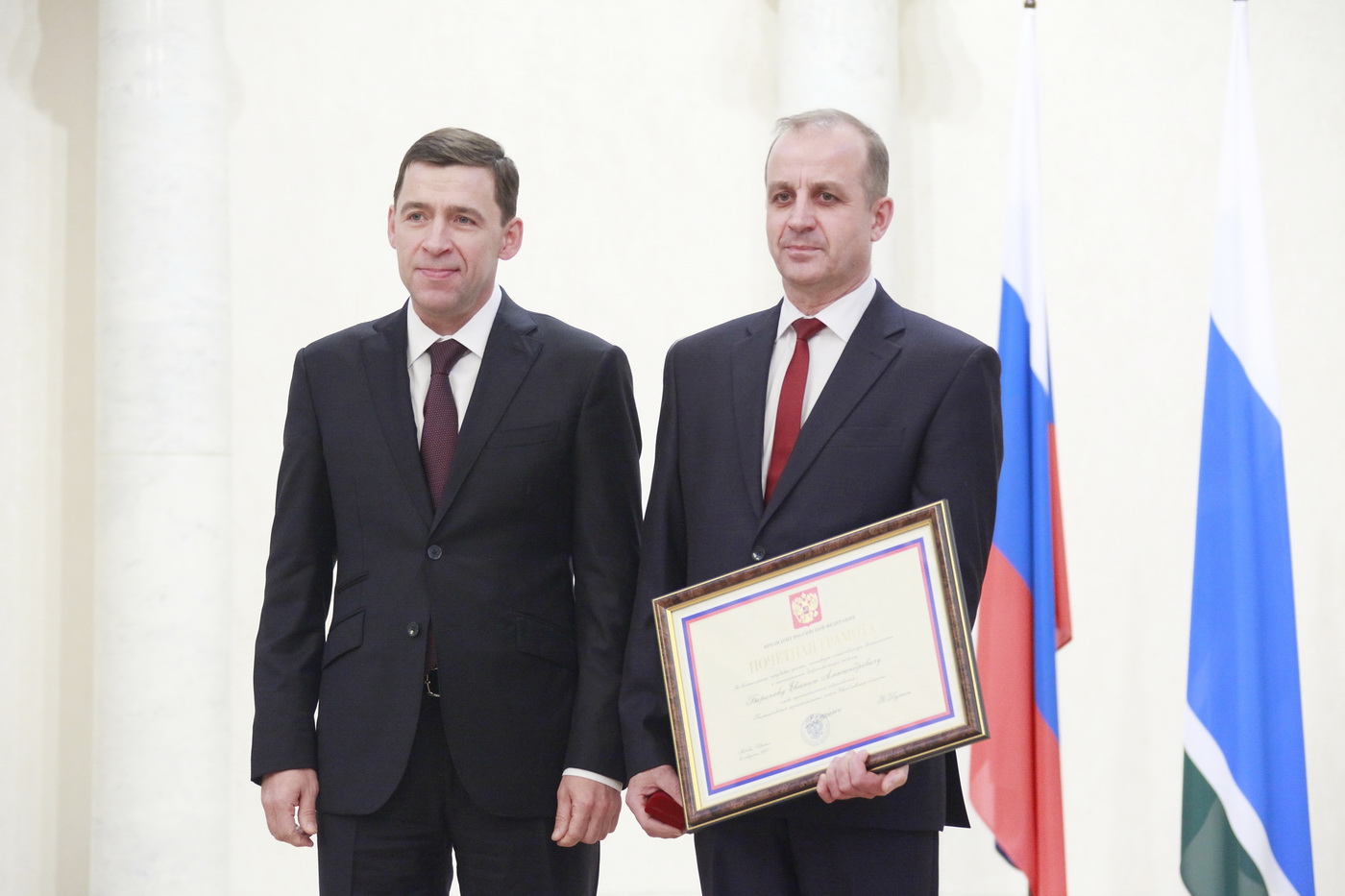 В День Конституции губернатор Евгений Куйвашев вручил награды уральцам, особо отличившимся в работе на благо Свердловской области. Главе Камышловского района Евгению Баранову вручена почетная грамота Президента РФ. За особые заслуги в сфере социального развития Свердловской области регионального знака отличия «За заслуги перед Свердловской областью» III степени удостоены начальник управления Кунарской сельской территории администрации городского округа Богданович Валентина Мартышкина и президент акционерного общества «Медицинская акционерная страховая компания» Руслан Хальфин. За особые заслуги в социально-экономической сфере жизни общества, способствовавшие укреплению и развитию Свердловской области, звание «Почетный гражданин Свердловской области» присвоено Анатолию Тарасову.