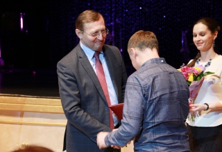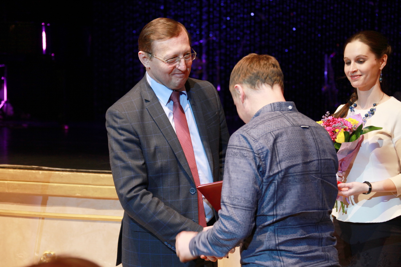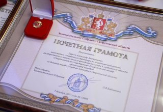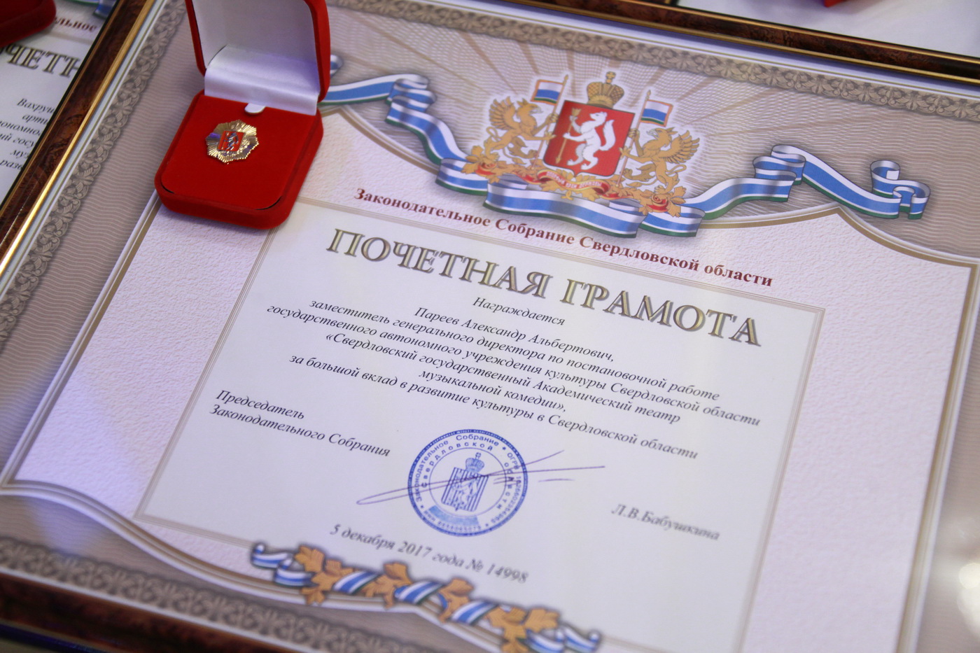Людмила Бабушкина вручила Почетные грамоты Законодательного Собарния Свердловской области двум работникам Свердловского государственного Академического театра музыкальной комедии - солисту Александру Вахрушеву и заместителю генерального директора по постановочной работе Александру Парееву.