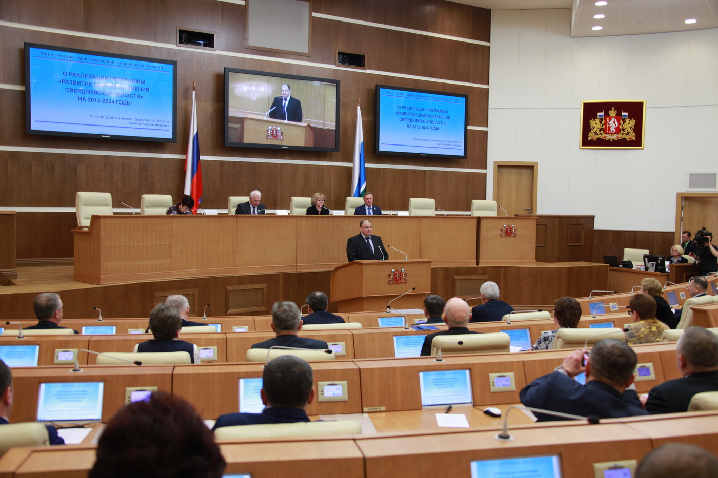 Под руководством председателя Законодательного Собрания руководители муниципальных дум рассмотрели вопрос, касающийся реализации государственной  областной программы «Развитие здравоохранения Свердловской области до 2024 года». На заседании выступил министр здравоохранения Свердловской области Андрей Цветков, который отметил что в 2017 году на реализацию программы «Развитие здравоохранения Свердловской области до 2024 года»  был  запланирован объем финансирования за счет всех источников в сумме 64 936,4 млн. рублей. В 2018 году расходы на реализацию программы  составили 110% от плана 2017 года или 71 301,4 млн. рублей.