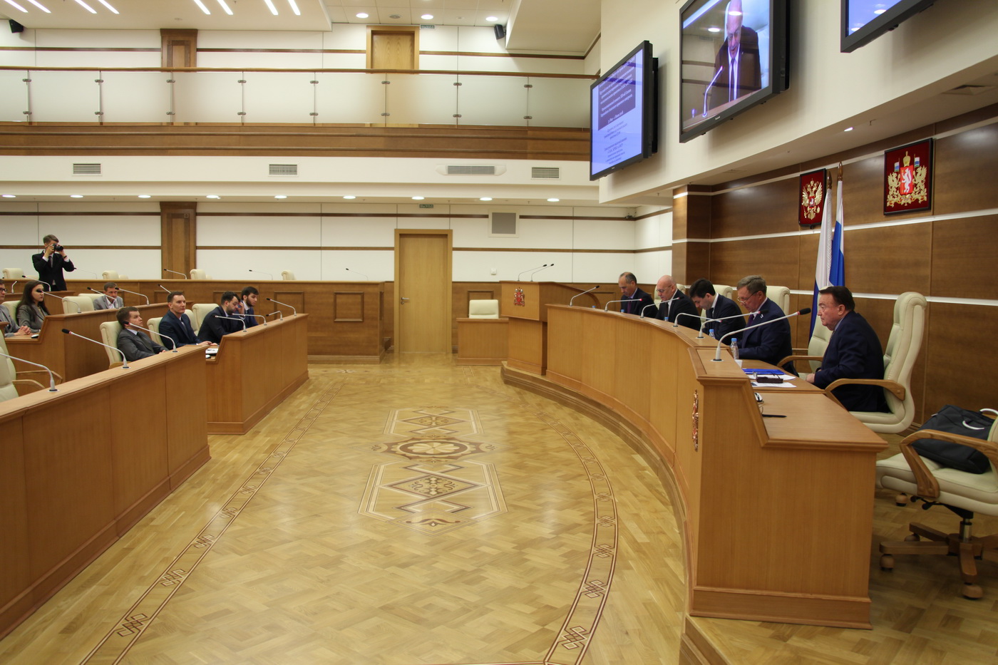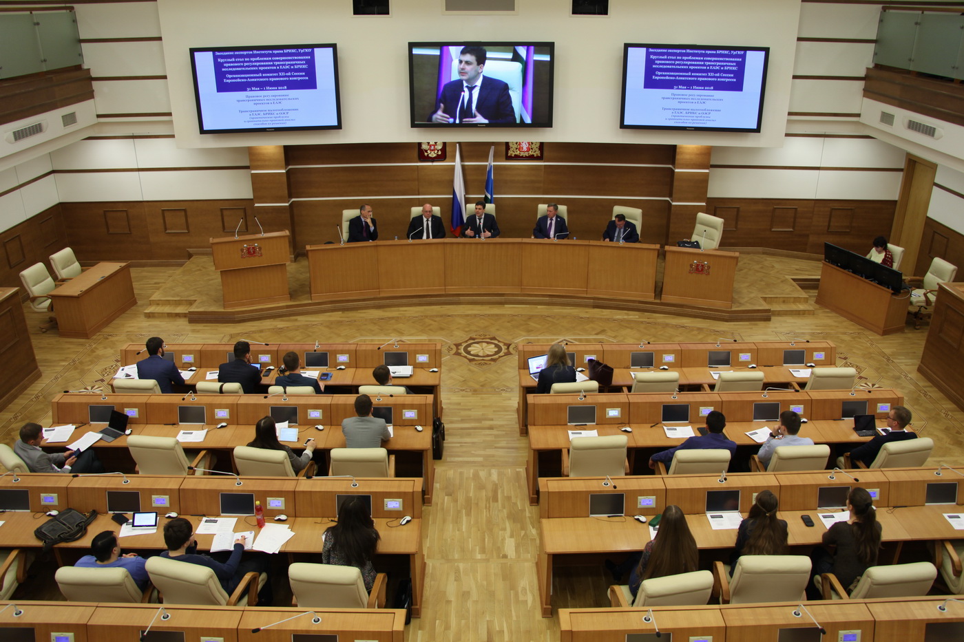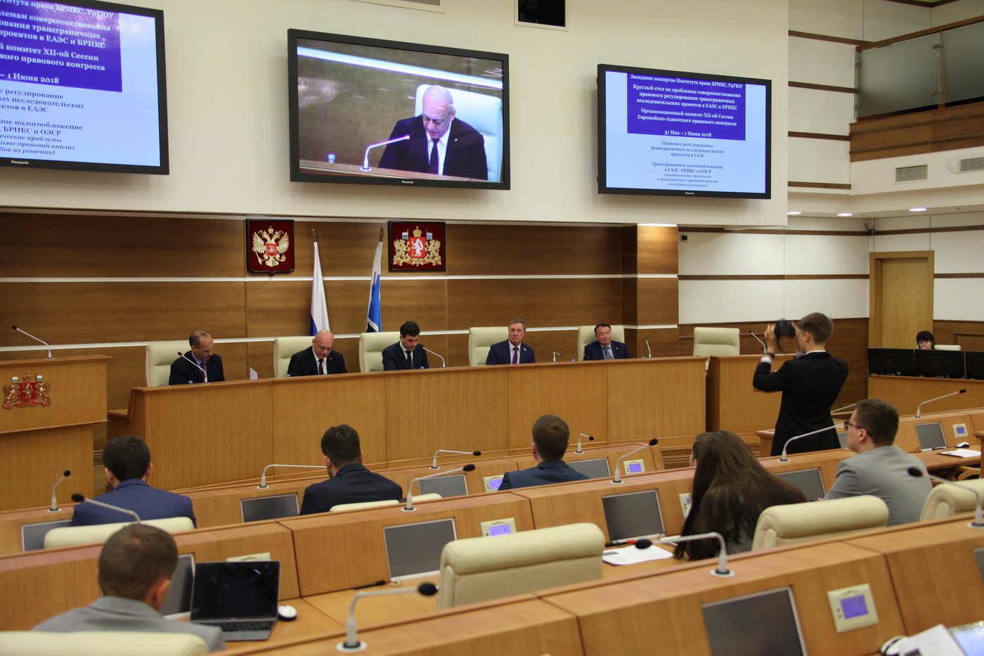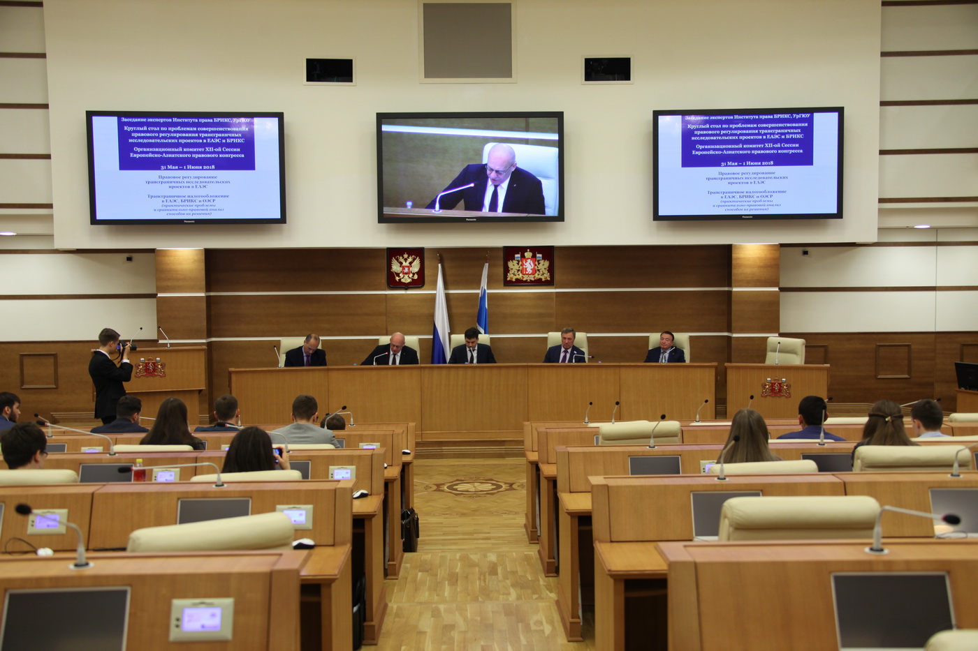 В рамках подготовки к XII-й сессии Европейско-Азиатского правового конгресса в Законодательном Собрании состоялось заседание организационного комитета конгресса и экспертов института права БРИКС. В нем приняли участие председатель комитета Законодательного Собрания Свердловской области по вопросам законодательства и общественной безопасности Владимир Никитин, ректор Уральского государственного университета юридического университета Владимир Бублик, председатель Академического совета Международного бюро фискальной документации Паскуале Пистоне.