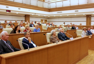 Председатель областного парламента вместе со своими заместителями Анатолием Суховым и Виктором Якимовым вручили Вячеславу Сурганову цветы и памятный подарок.
