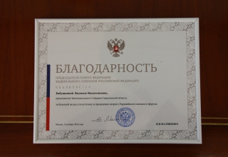 Спикер Совета Федерации ФС РФ Валентина Матвиенко провела совещание по подведению итогов Второго Евразийского женского форума, который состоялся в период с 19 по 21 сентября в Санкт-Петербурге. В мероприятии участвовала председатель Законодательного Собрания Свердловской области Людмила Бабушкина. За работу по подготовке и проведению форума она была награждена Благодарностью Председателя Совета Федерации ФС РФ.
