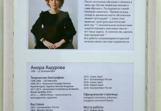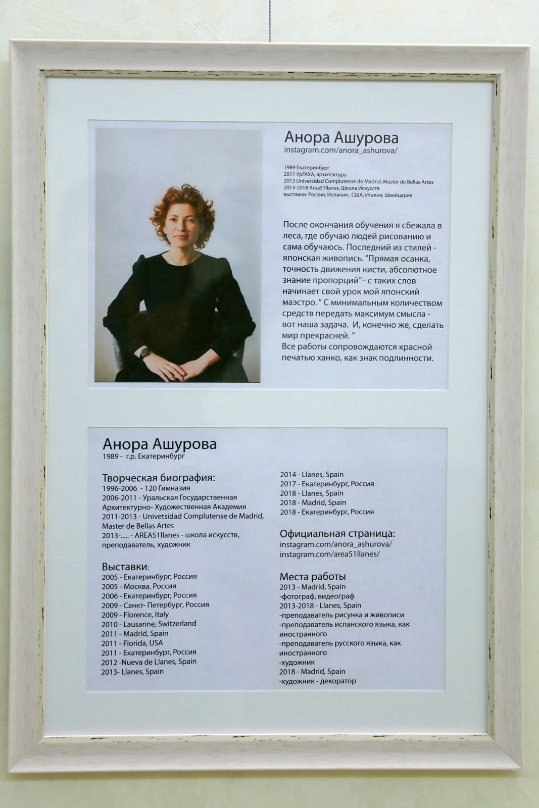 Автор выставки, Анора Ашурова, родилась в Екатеринбурге. Выпускница Уральской государственной архитектурной академии, художница получила степень магистра в мадридском университете. С 2013 года Анора Ашурова является преподавателем школы искусств города Льянес (Испания). Кроме рисунка и живописи она также преподает испанский язык как иностранный и русский язык как иностранный.