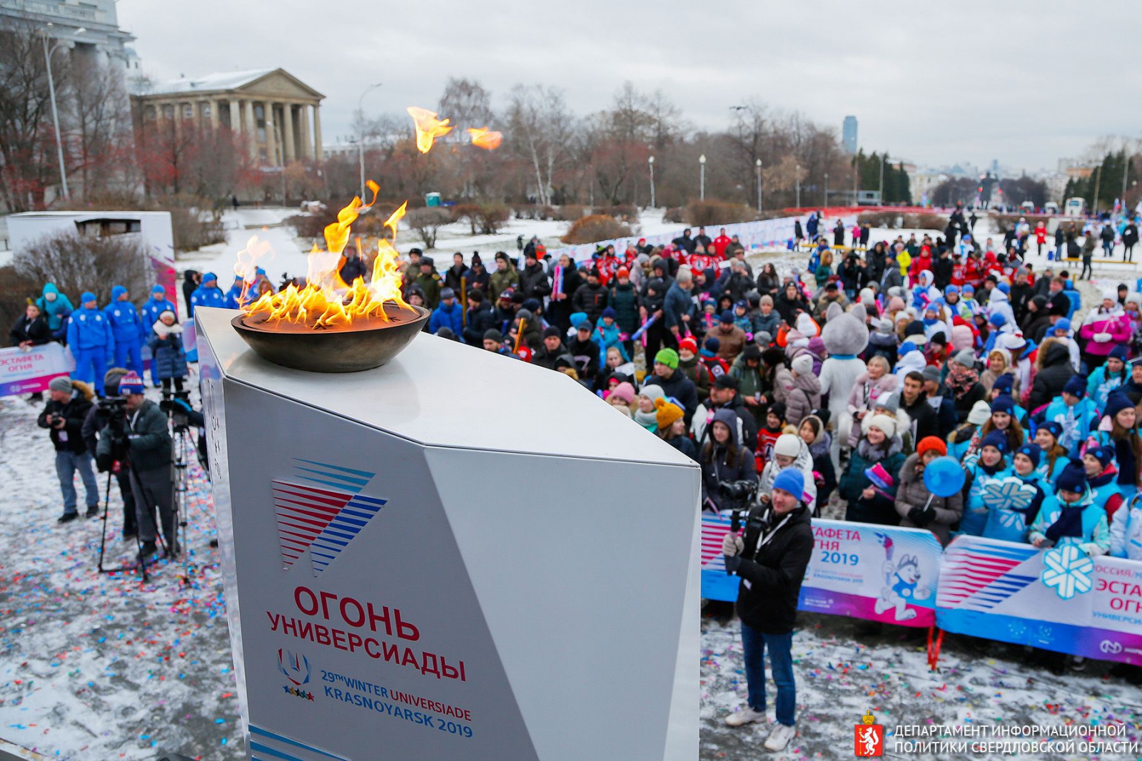 Завершился этап Эстафеты огня в Екатеринбурге на площади Кирова, где зажгли городскую чашу огня.