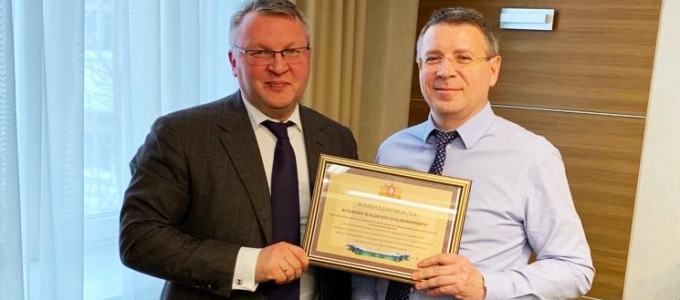 Также депутат вручил председателю «Союза» Владилену Фуфарову благодарность за большой вклад в развитие потребительского рынка Свердловской области и работу с подрастающим поколением в рамках профессиональной ориентации.