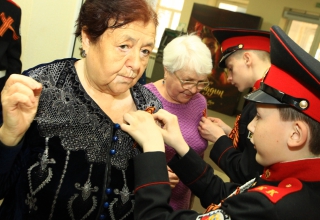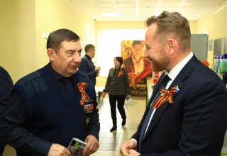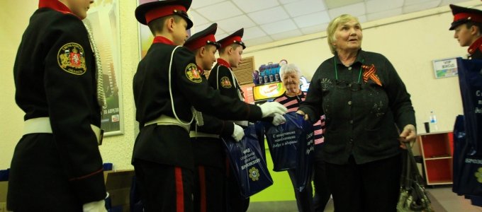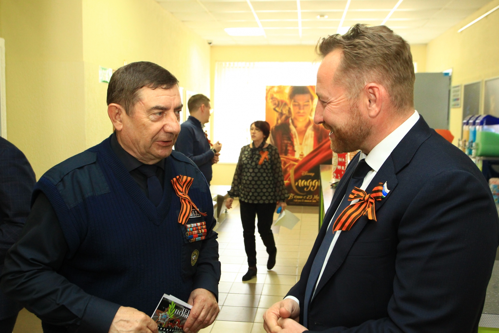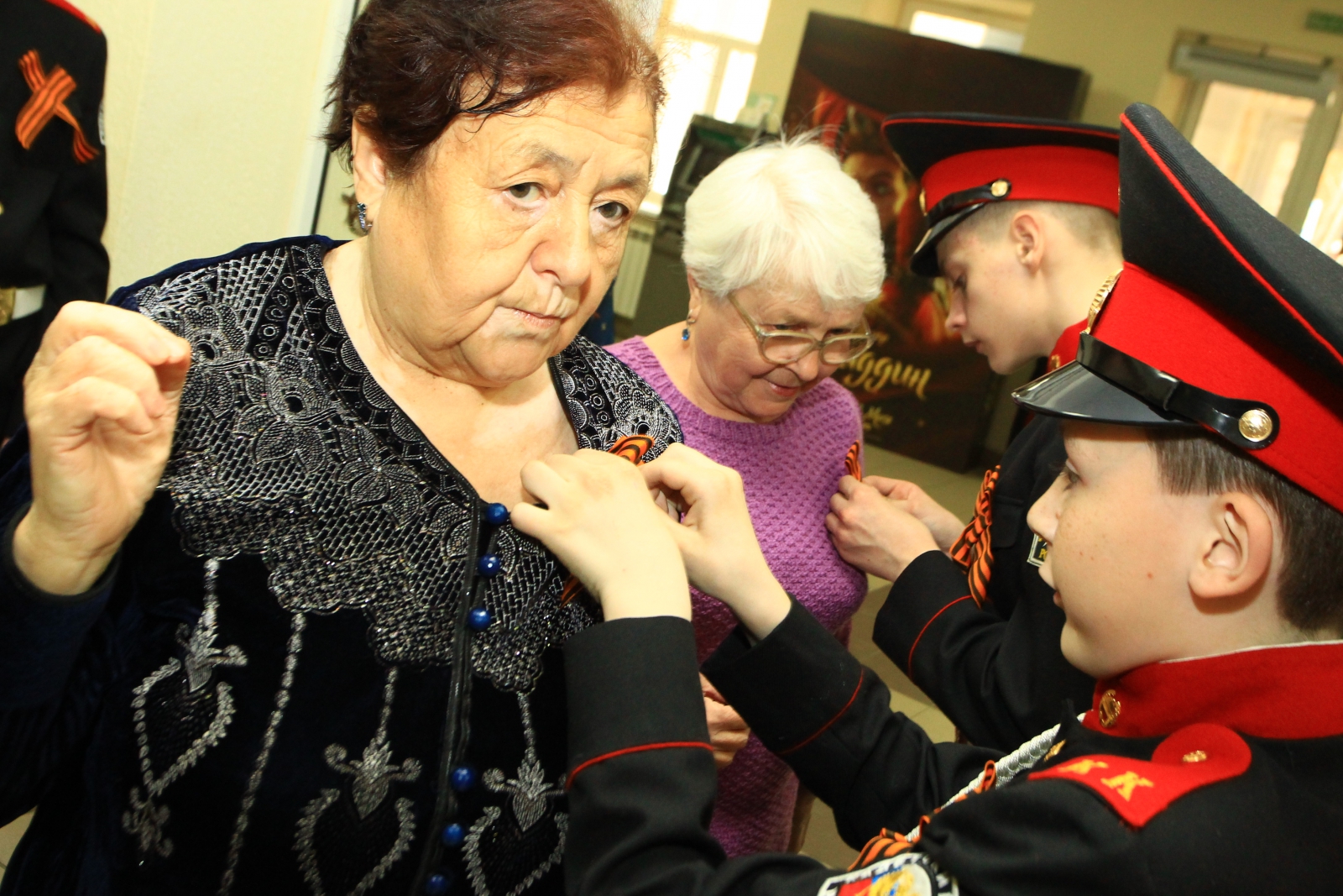 На входе в кинотеатр гостей встречали воспитанники кадетской школы-интерната механико-технологического техникума «Юность», поздравляли с наступающим Днем Победы, прикрепляли георгиевские ленточки, помогали подняться в зал.