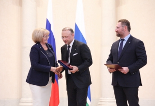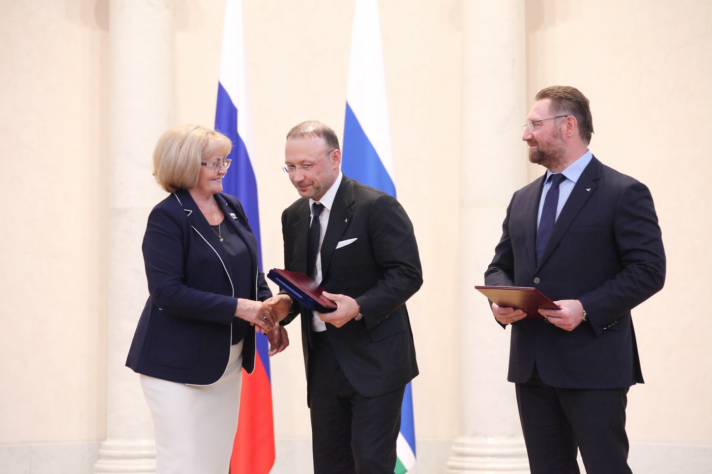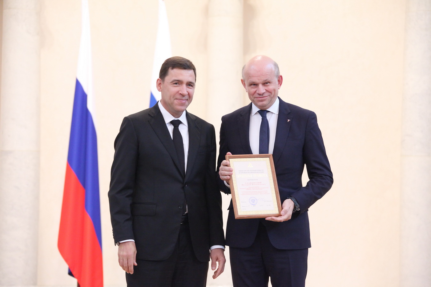 Поздравительные адреса Законодательного Собрания Свердловской области Людмила Бабушкина вручила председателю совета директоров, основателю «Русской медной компании» Игорю Алтушкину и президенту РМК Всеволоду Левину.