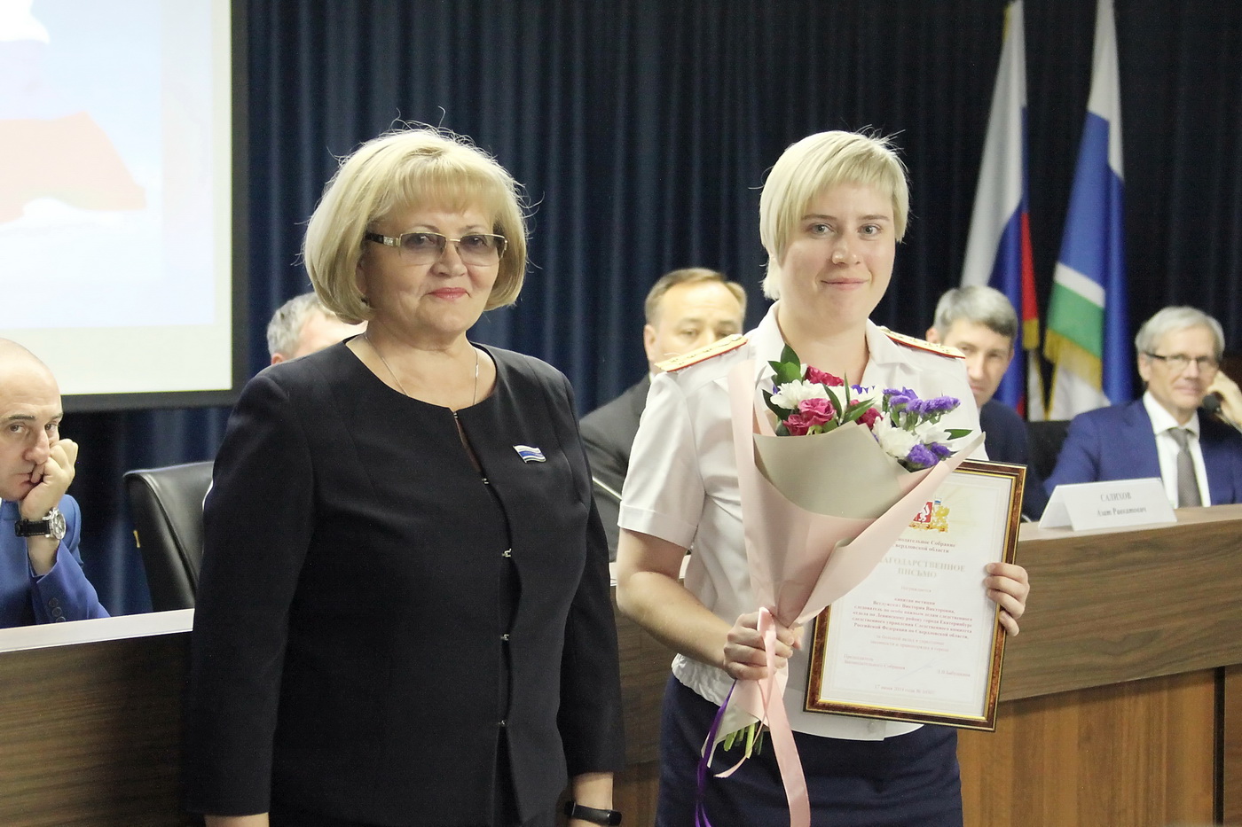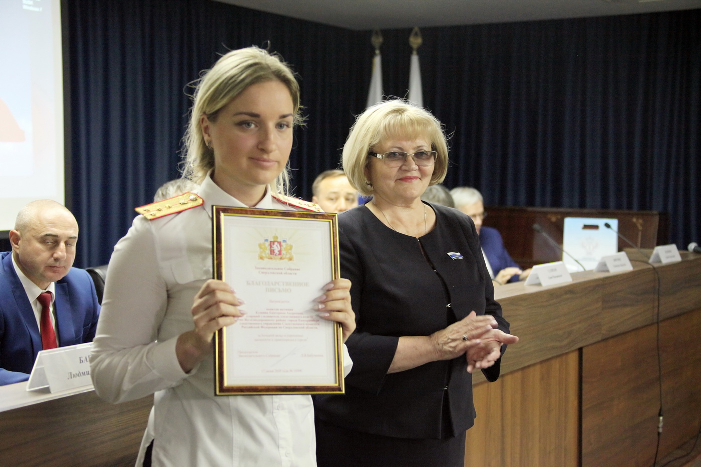 Председатель Законодательного Собрания вручила памятный адрес руководителю следственного управления Следственного комитета России по Свердловской области генерал-лейтенанту юстиции Михаилу Богинскому. Ряд сотрудников следствия были награждены Благодарственными письмами Законодательного Собрания Свердловской области.