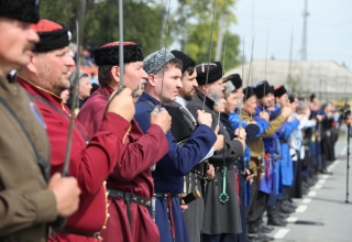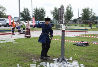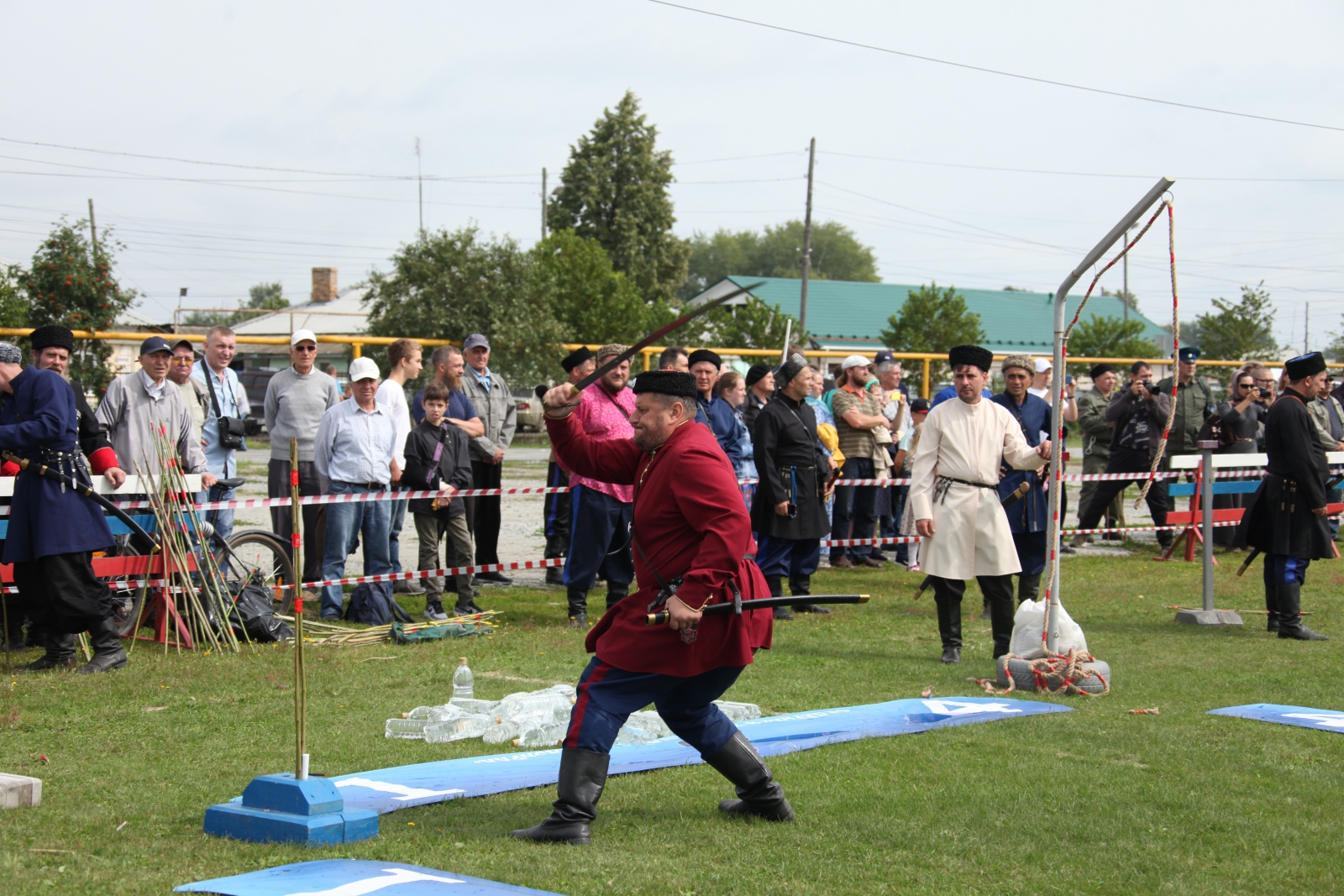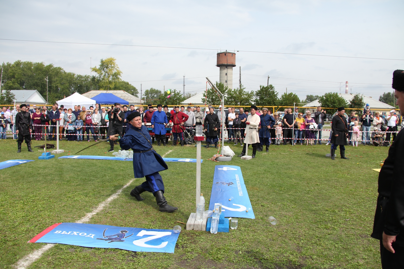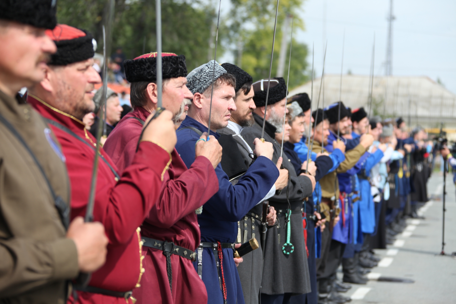 Большим подарком для гостей и участников «Казарлы» стали показательные выступления по рубке шашкой с коня, а также дефиле в традиционных казачьих костюмах.