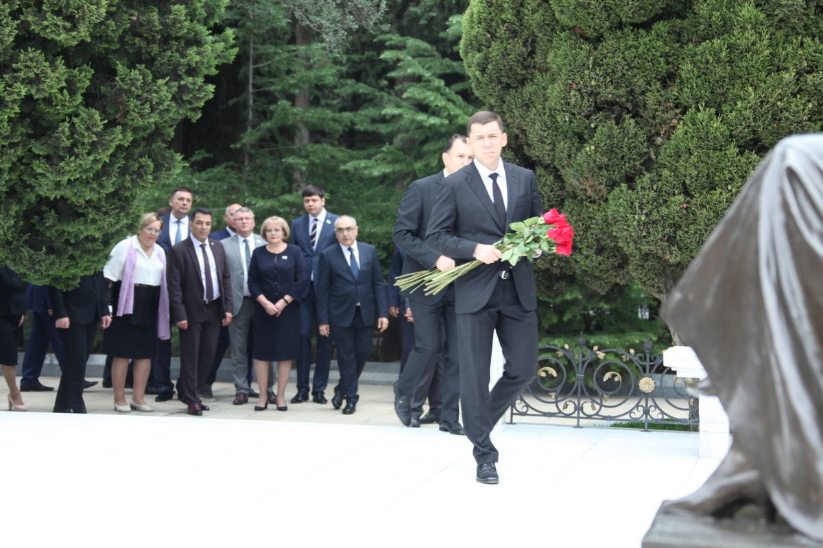 Губернатор Евгений Куйвашев, председатель Законодательного Собрания Людмила Бабушкина, депутаты Сергей Никонов, Вячеслав Вегнер, МИхаил Зубарев и члены делегации Свердловской области 11 сентября в Баку возложили цветы к могиле общенационального лидера Азербайджанской Республики, третьего Президента государства Гейдара Алиева и к Вечному огню. В торжественно-траурной церемонии принял участие заместитель министра экономики Азербайджана Сахиб Мамедов.