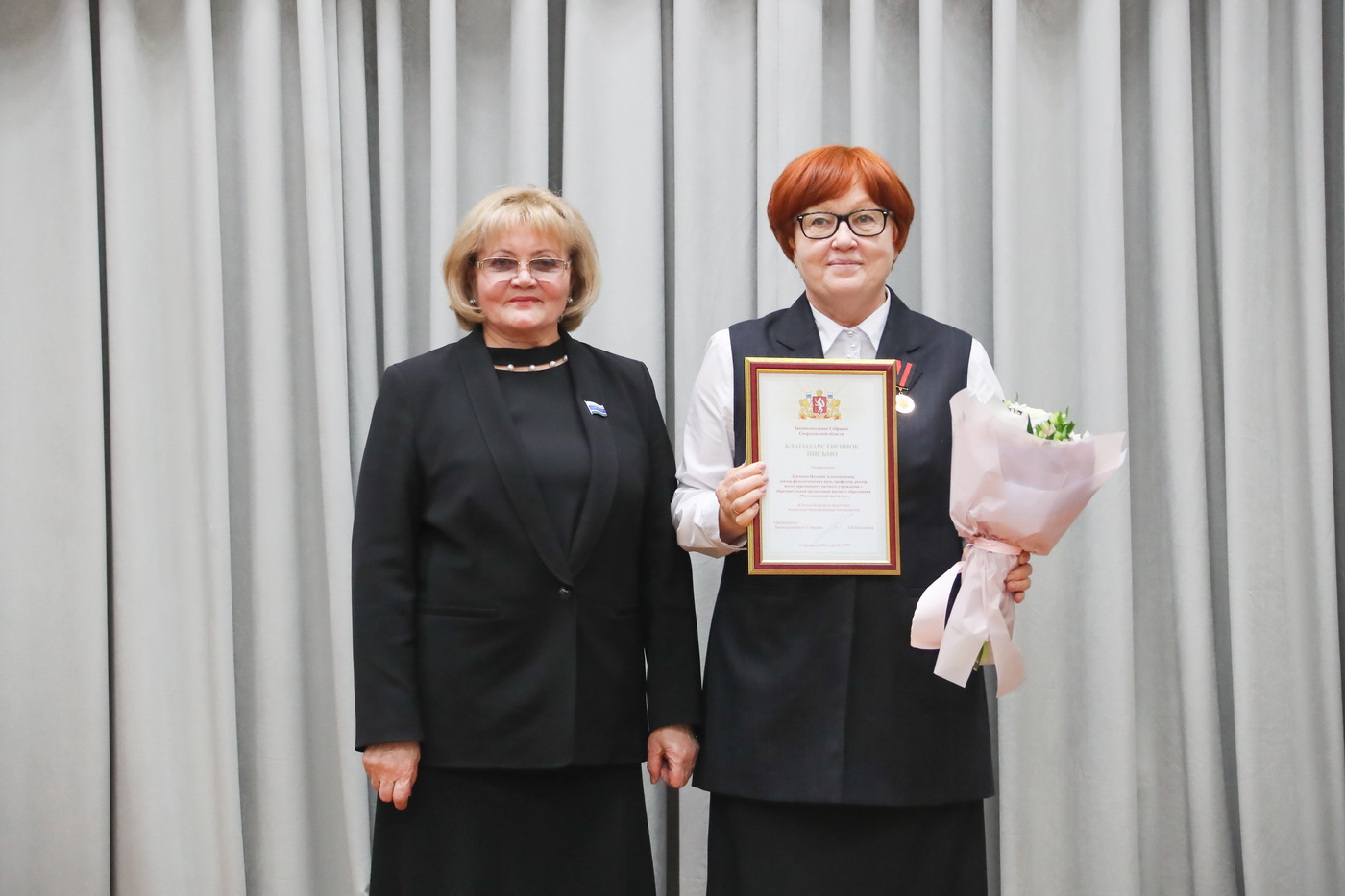 Людмила Бабушкина вручила награды областного парламента сотрудникам Екатеринбургской епархии, преподавателям Екатеринбургской духовной семинарии, священнослужителям. За большой вклад в сохранение и укрепление духовно-нравственных ценностей Екатеринбургская Епархия была награждена Благодарственным письмом Законодательного Собрания.