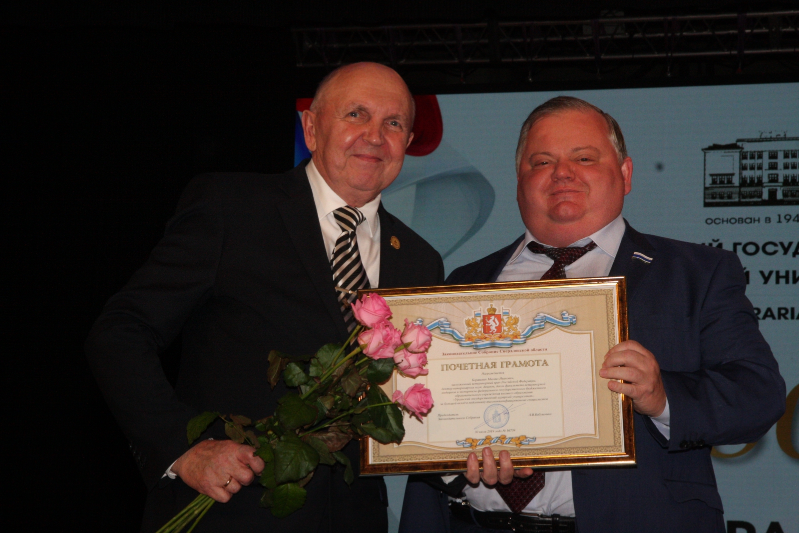 В Екатеринбурге во Дворце молодежи собрались сотрудники, студенты и выпускники вуза-юбиляра – Уральского государственного аграрного университета. Заместитель председателя Законодательного Собрания Виктор Маслаков обратился к участникам торжественного собрания с приветственным адресом от председателя свердловского парламента Людмилы Бабушкиной и вручил самым выдающимся сотрудникам награды Законодательного Собрания Свердловской области.