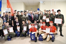 Перед вручением наград каждый юнармейский коллектив поздравил всех мужчин, присутствовавших на мероприятии, с Днем защитника Отечества.