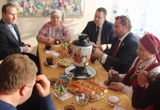 После церемонии открытия депутат Законодательного Собрания Свердловской области Вячеслав Брозовский совместно с приглашенными гостями прошли к заводской проходной для ознакомления с помещением клуба. На крыльце их встречали с хлебом-солью участники клуба в народных костюмах. В помещении клуба гостей ждал ароматный чай и вкусная домашняя выпечка.