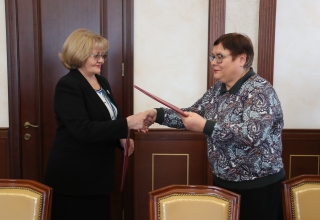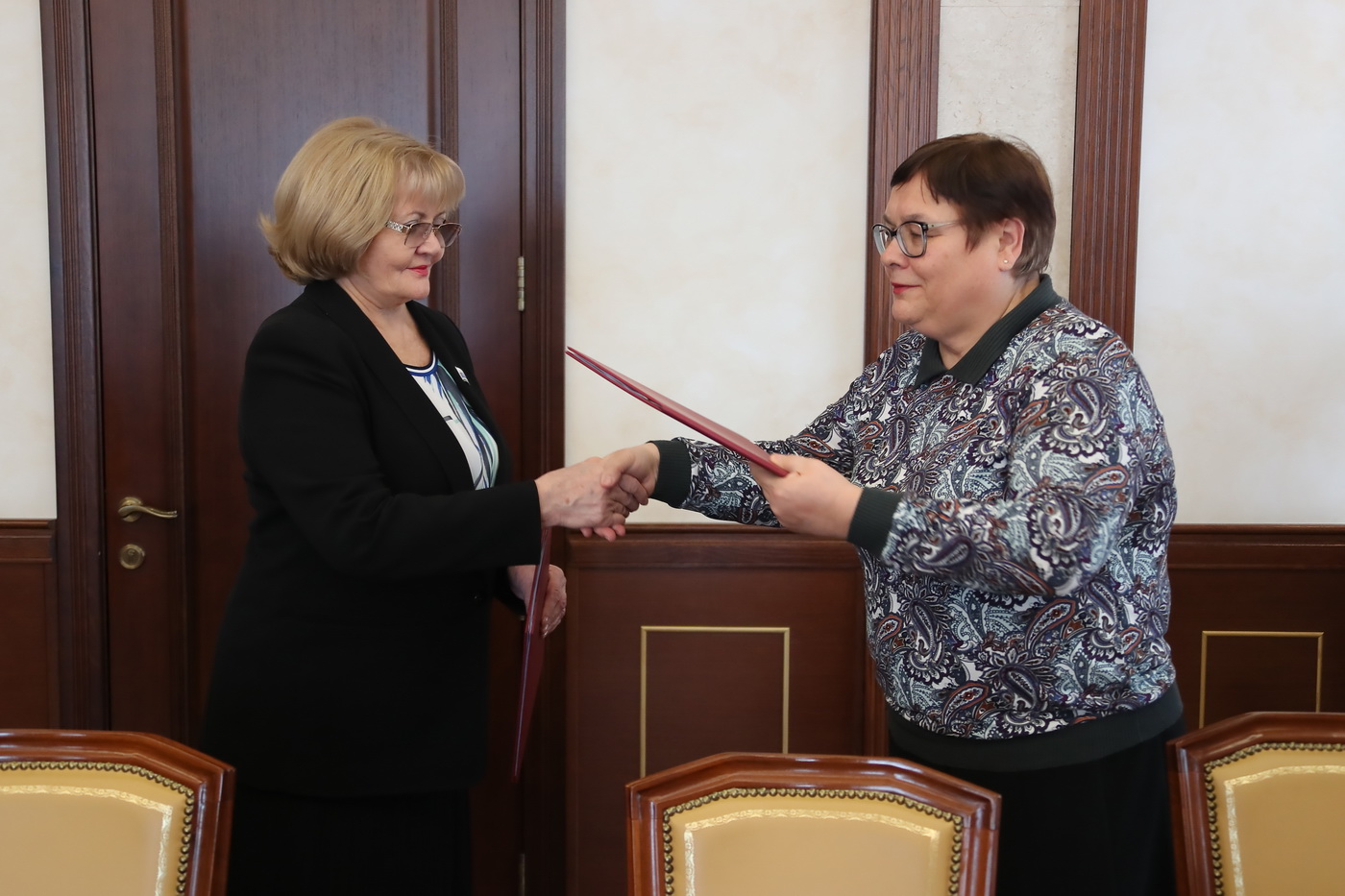 Председатель Законодательного Собрания Людмила Бабушкина и председатель профсоюзного комитета Законодательного Собрания Елена Ширина скрепили подписями новый коллективный договор. В церемонии подписания приняла участие председатель Екатеринбургской городской организации профсоюза работников государственных учреждений и общественного обслуживания Вера Струина.