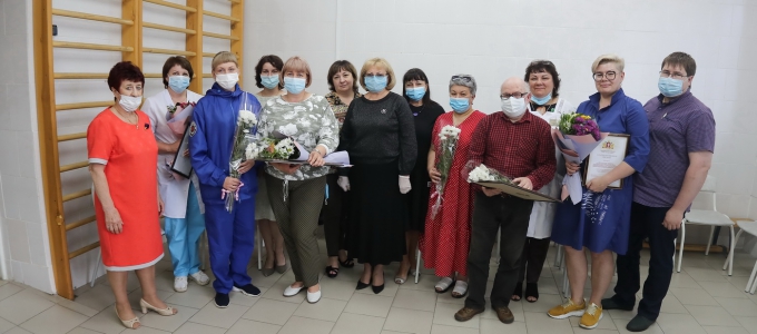 Людмила Бабушкина вручила Почетные грамоты Законодательного Собрания Свердловской области заведующей фельдшерско-акушерским пунктом «Территория Еланского военного городка, здание поликлиники инв. №8/38» государственного бюджетного учреждения здравоохранения Свердловской области «Камышловская центральная районная больница» Ольге Казанцевой и врачу-терапевту, заведующему терапевтическим отделением государственного бюджетного учреждения здравоохранения Свердловской области «Камышловская центральная районная больница» Вениамину Дубовкину. Благодарственные письма Законодательного Собрания Свердловской области из рук Людмилы Бабушкиной получили медицинская сестра, анестезист отделения реанимации и интенсивной терапии государственного бюджетного учреждения здравоохранения Свердловской области «Камышловская центральная районная больница» Мария Васкецова и провизор, заведующая аптекой готовых лекарственных форм государственного бюджетного учреждения здравоохранения Свердловской области «Камышловская центральная районная больница» Жанна Никулина.